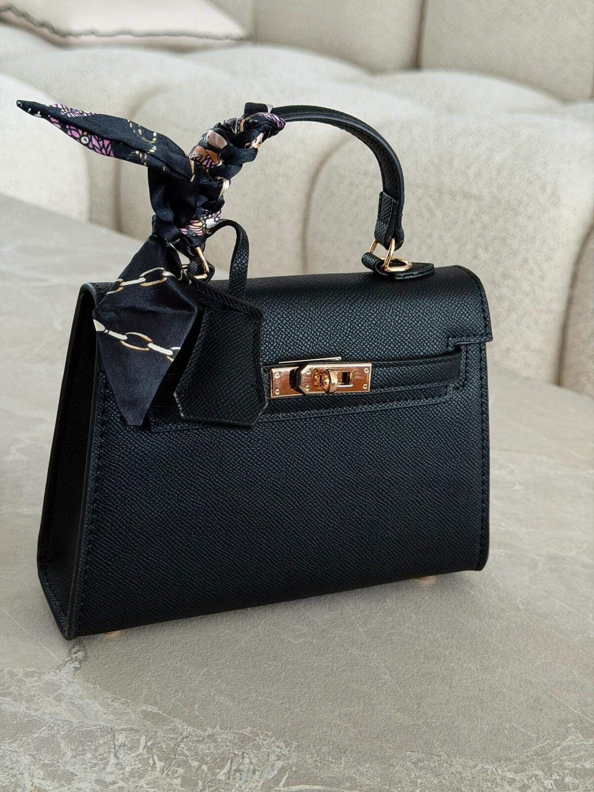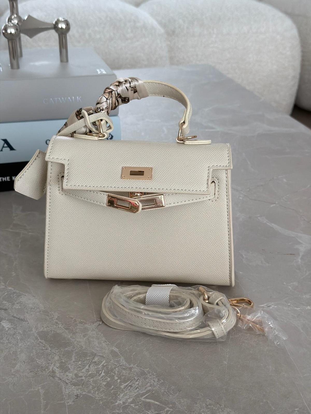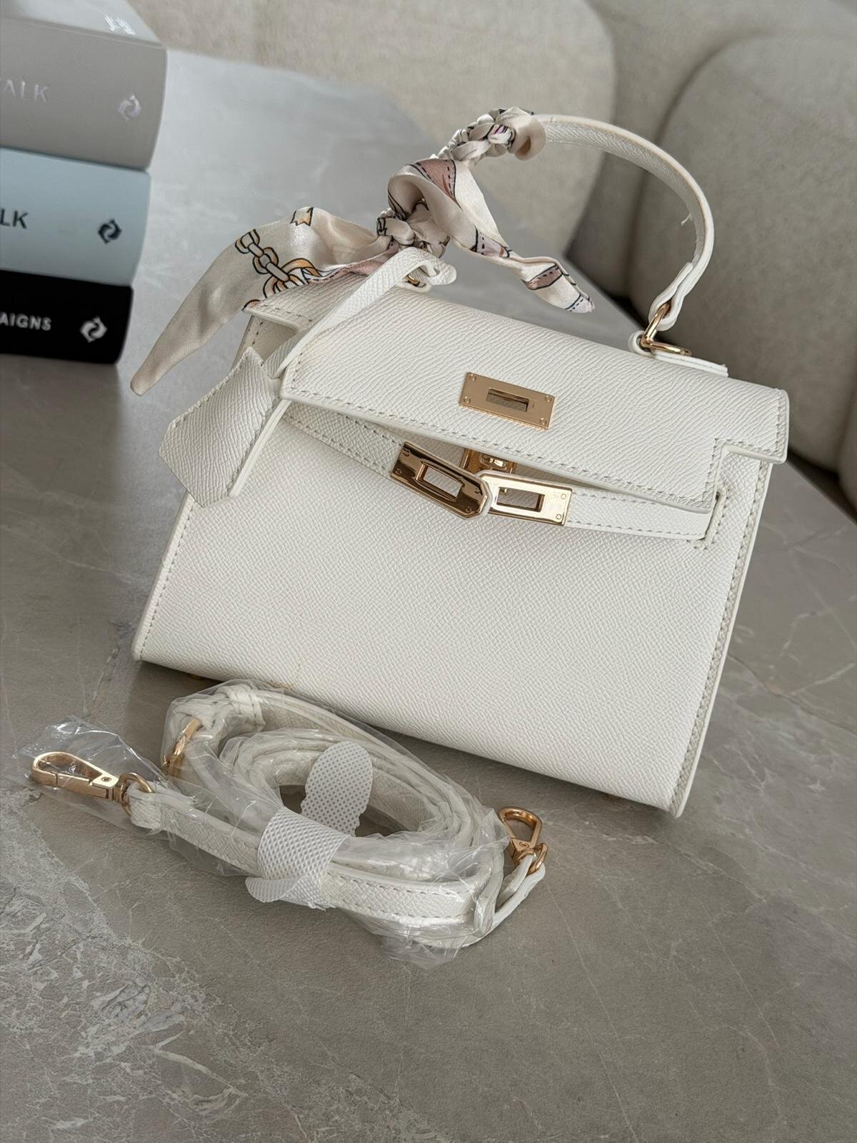 Elegancka bia艂a torebka damska mini typu Kelly ze z艂otymi okuciami i ozdobn膮 apaszk膮 przy r膮czce. Stylowy, ponadczasowy model idealny do eleganckich i codziennych stylizacji.