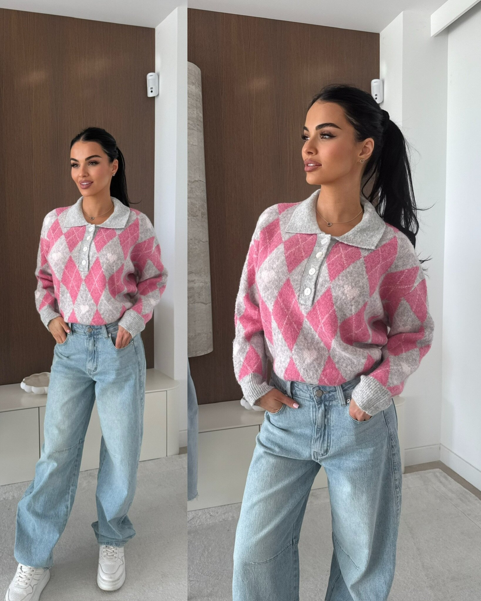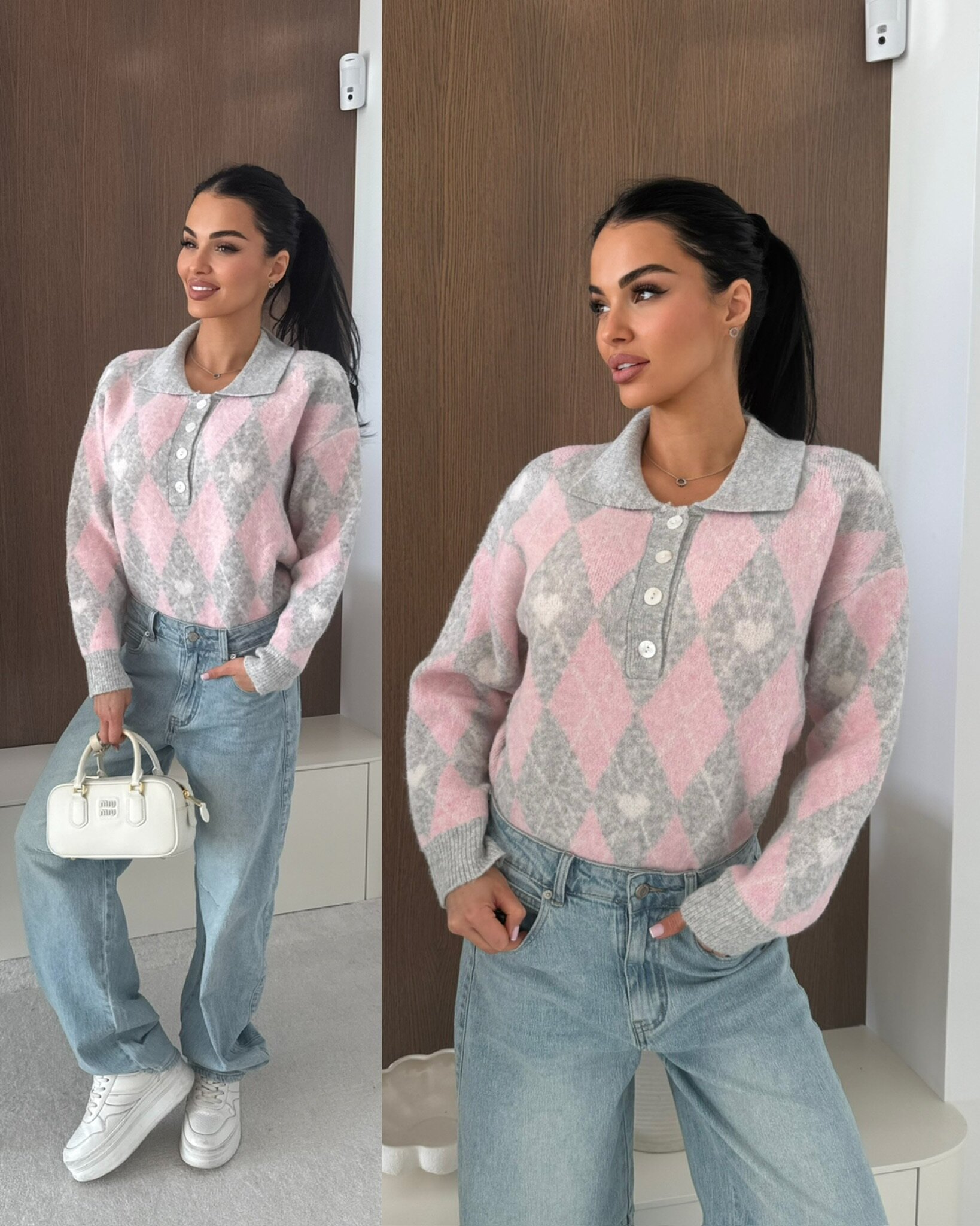 Stylowy sweter z dzianiny o modnym wzorze geometrycznym to idealny wyb贸r na co dzie艅 i na p贸艂formalne stylizacje. Model z ko艂nierzykiem i zapi臋ciem na guziki 艂膮czy klasyczny fason z nowoczesnym designem, zapewniaj膮c wygod臋 noszenia oraz uniwersalno艣膰. Doskonale sprawdzi si臋 w stylizacjach casualowych, do pracy lub na spotkania.