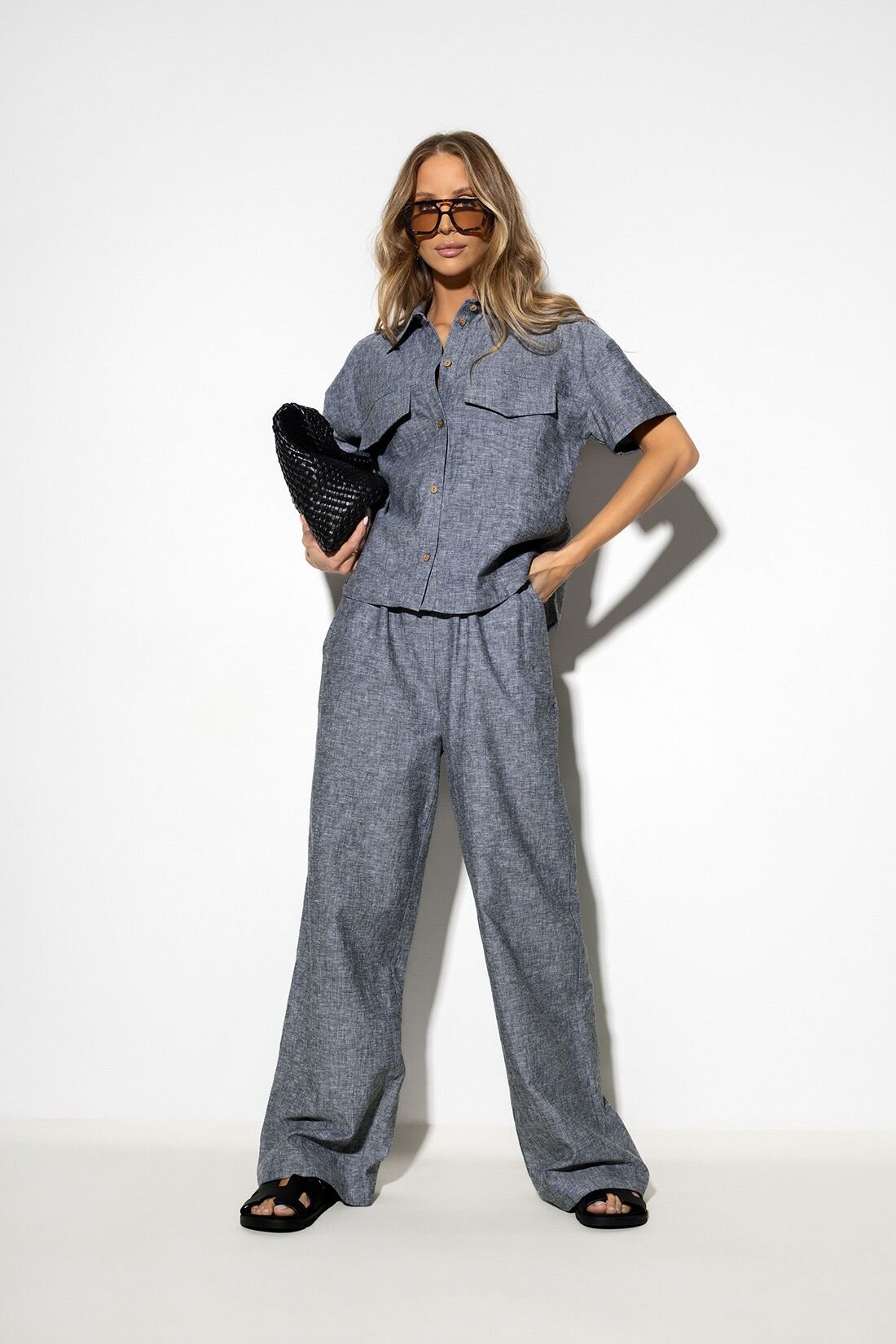 The Nerro set is a stylish combination of naturalness and modern design. This two-piece set, made from a high-quality linen and cotton blend, consists of a loose short-sleeve shirt and wide-leg trousers. The breathable fabric with a delicate texture and relaxed fit makes it an ideal base for summer, urban total-look outfits, providing maximum comfort.
