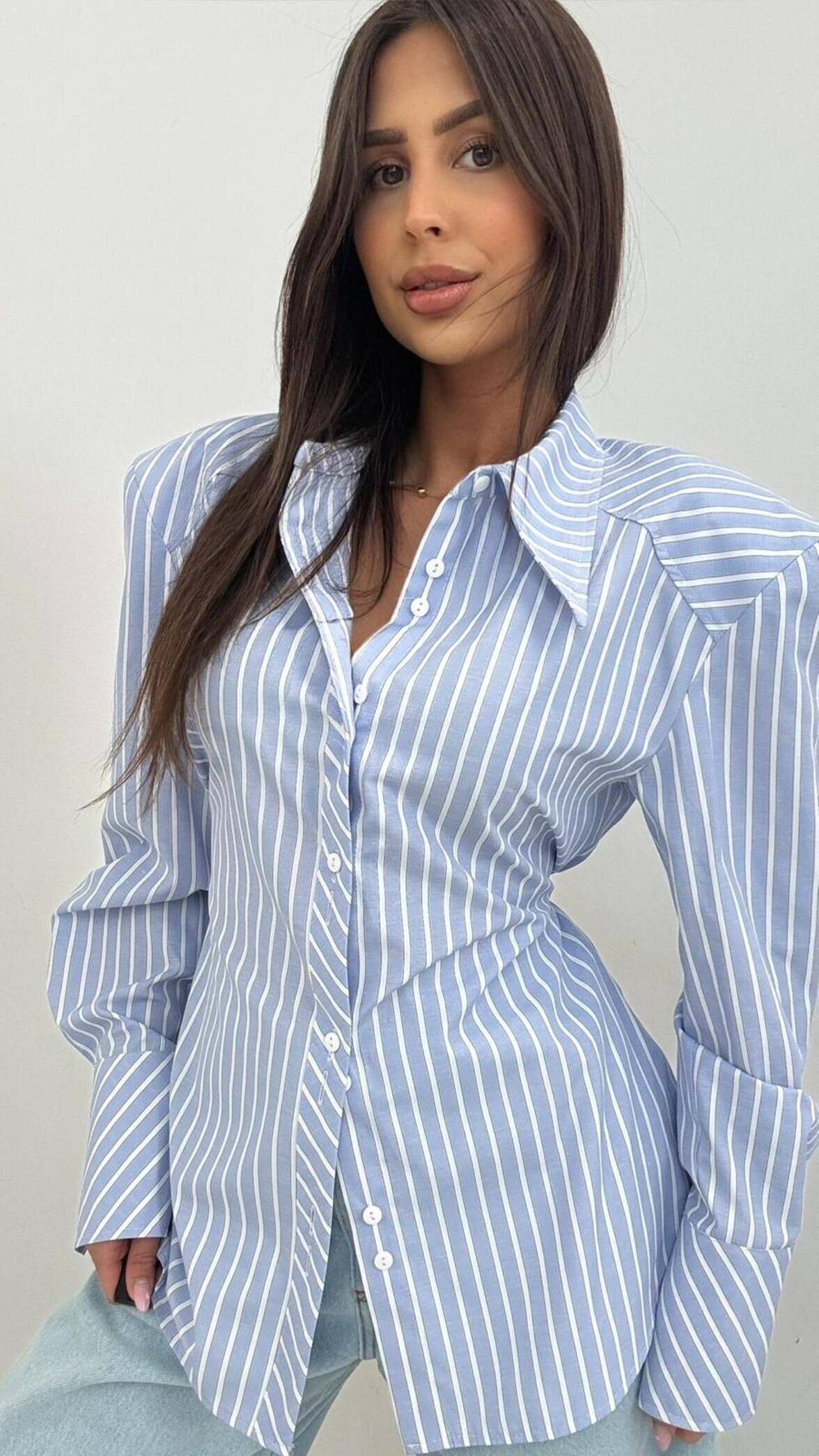 The Clarissa striped shirt is a stylish and modern option for women who appreciate elegance with a fashionable touch. The model stands out with its elongated collar and shoulder pads that shape the silhouette and give it a more defined structure. The attached belt beautifully accentuates the waist and allows for an adjustable fit. Perfect for office outfits, casual looks, and elegant ensembles.