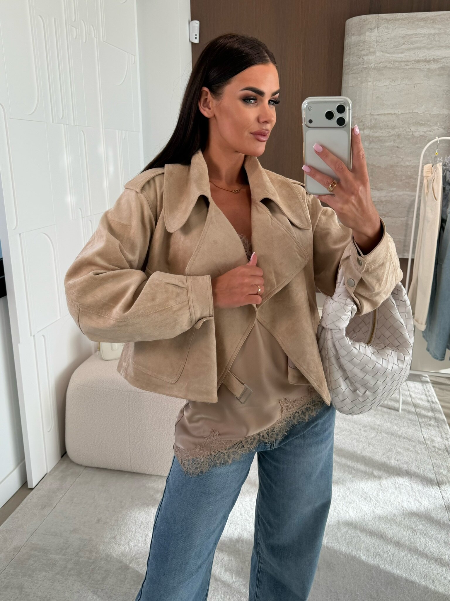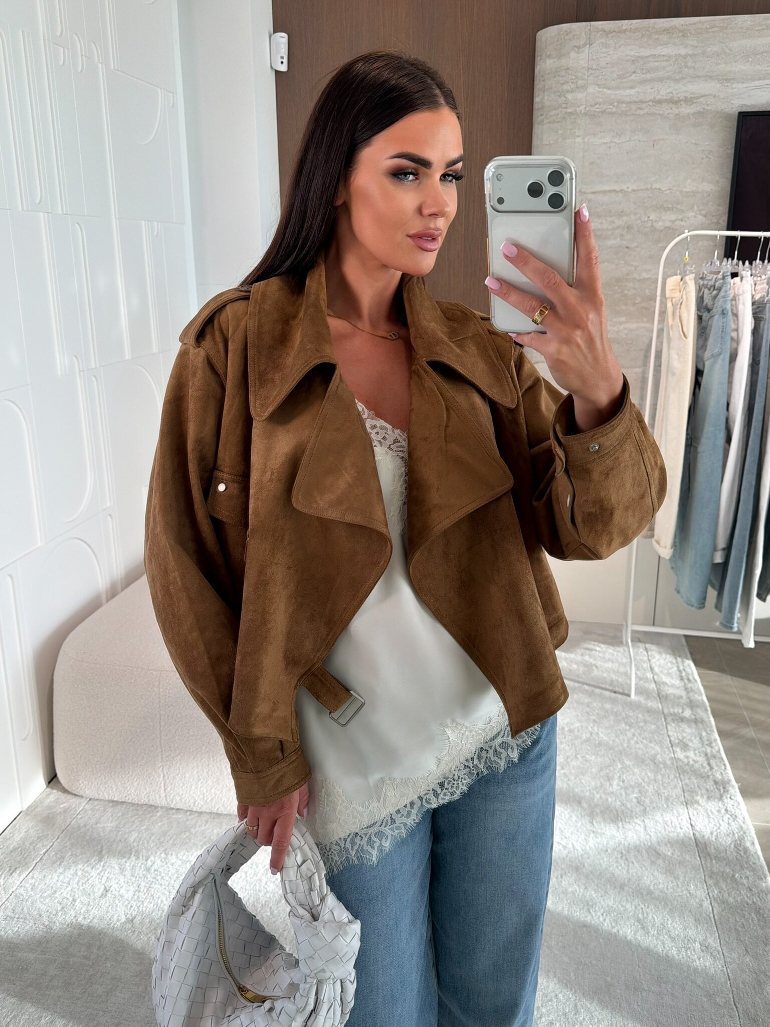 Lu藕niejszy kr贸j, zamszowe wyko艅czenie. Talia regulowana paskiem