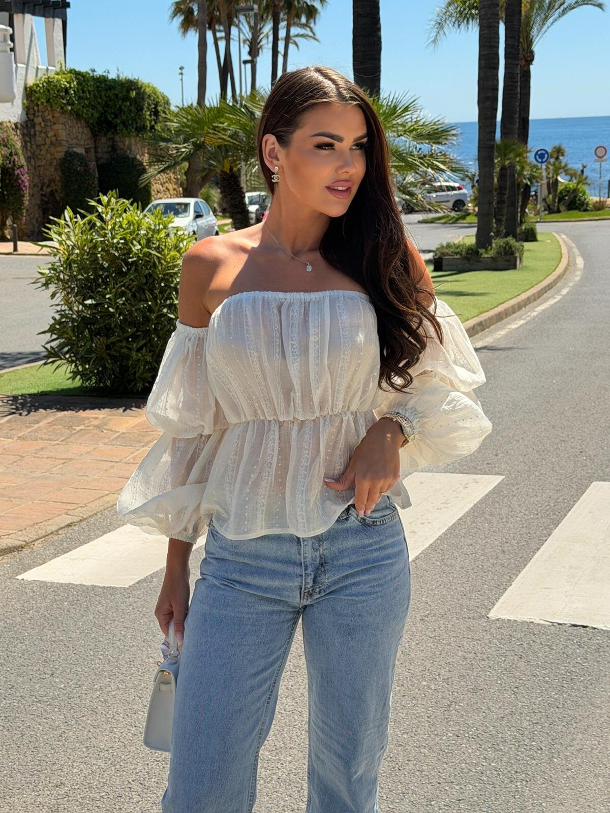 Bluzka Alira to stylowa hiszpanka, która łączy elegancki kolor ecru z subtelnym, wypukłym wzorem w odcieniu pudrowego różu. odkryte ramiona i bufiaste rękawy podkreślają kobiecą sylwetkę, a lekka, przewiewna wiskoza zapewnia komfort noszenia w ciepłe dni. idealna na lato, randki i eleganckie wyjścia.