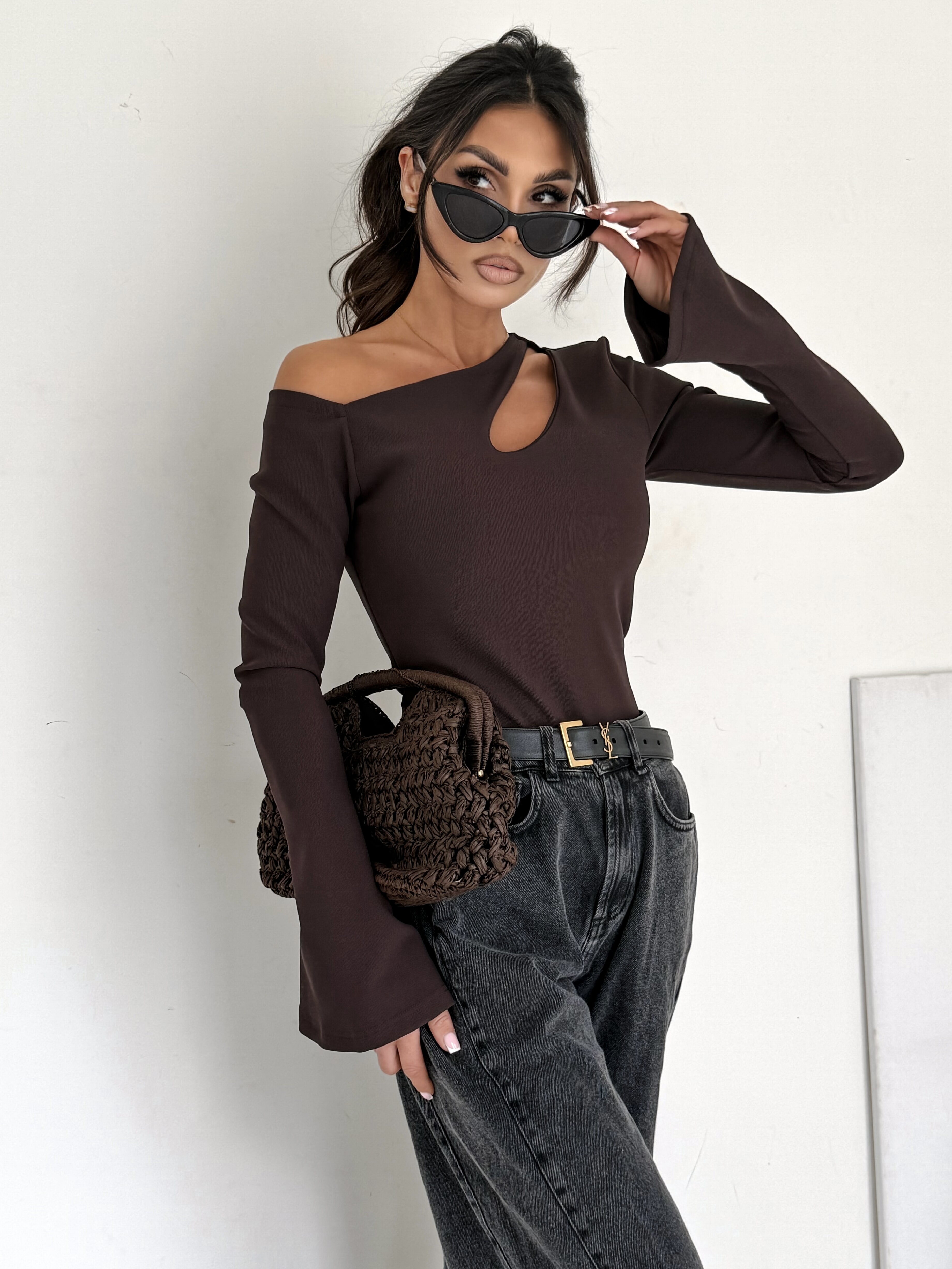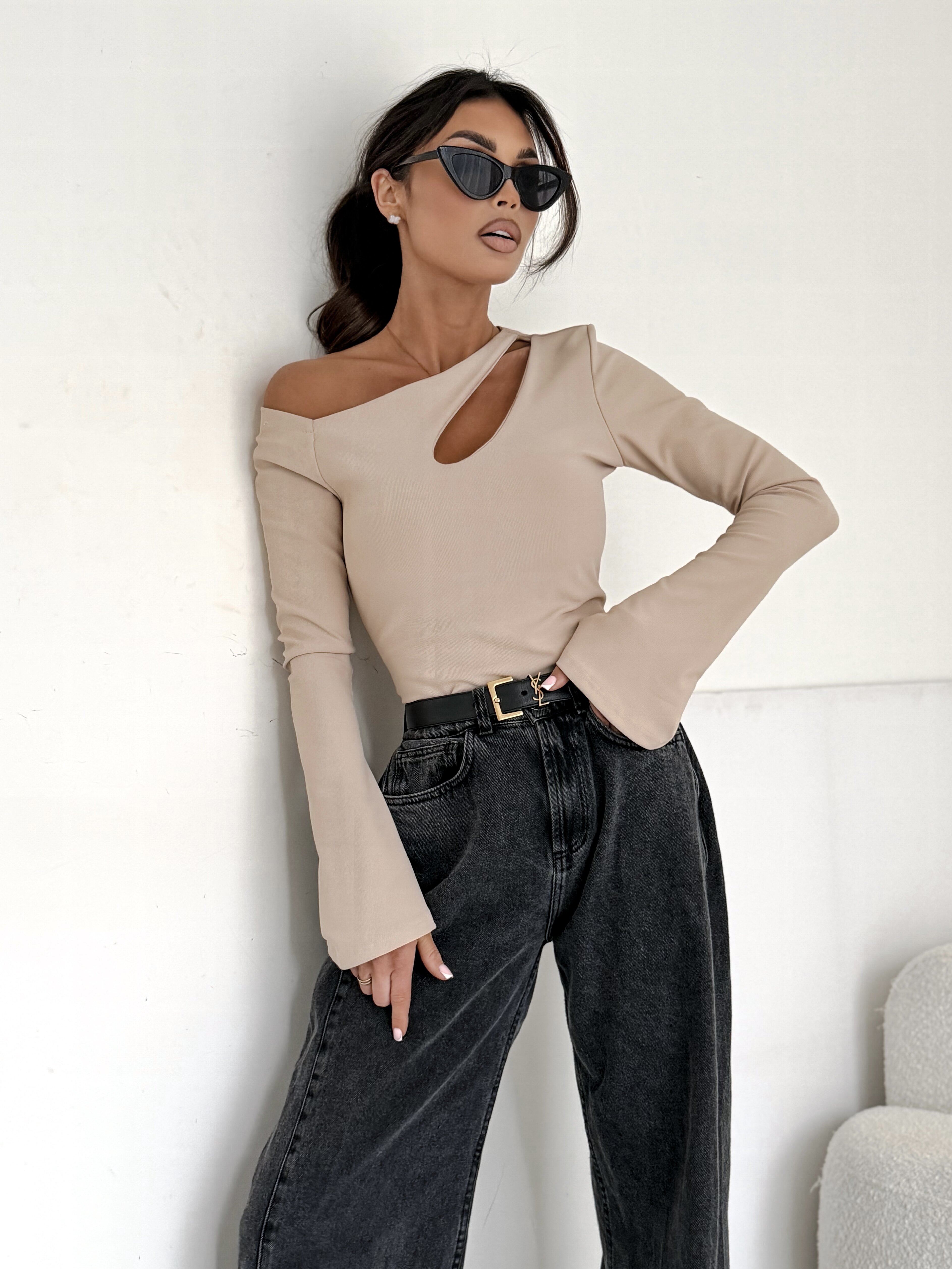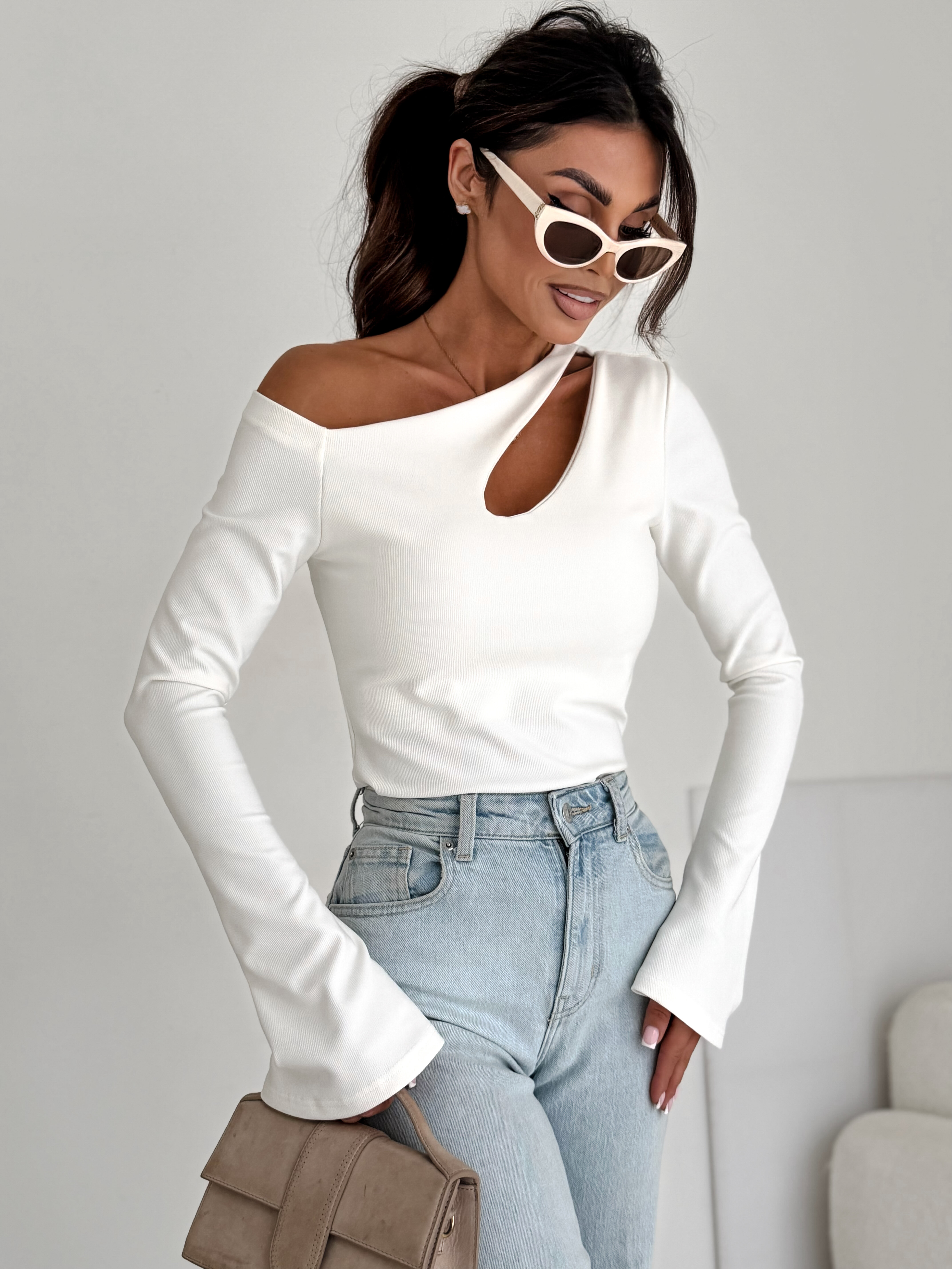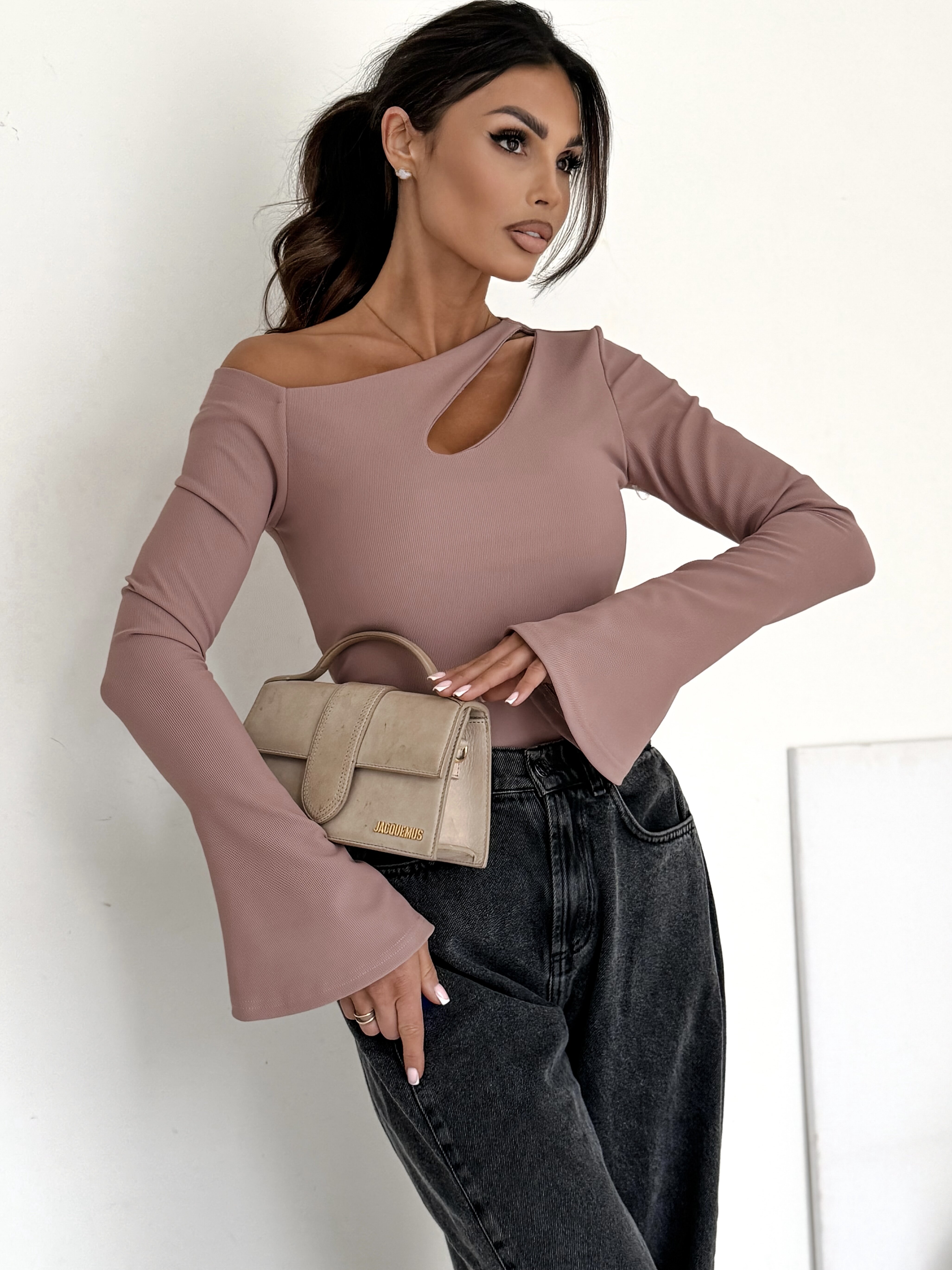 Bluzka damska z asymetrycznym dekoltem to nowoczesna i stylowa propozycja podkreślająca kobiecy charakter stylizacji. Ozdobne wycięcie w kształcie łezki oraz długie, rozkloszowane rękawy nadają całości wyjątkowego wyglądu. Idealna do eleganckich i modnych outfitów.
