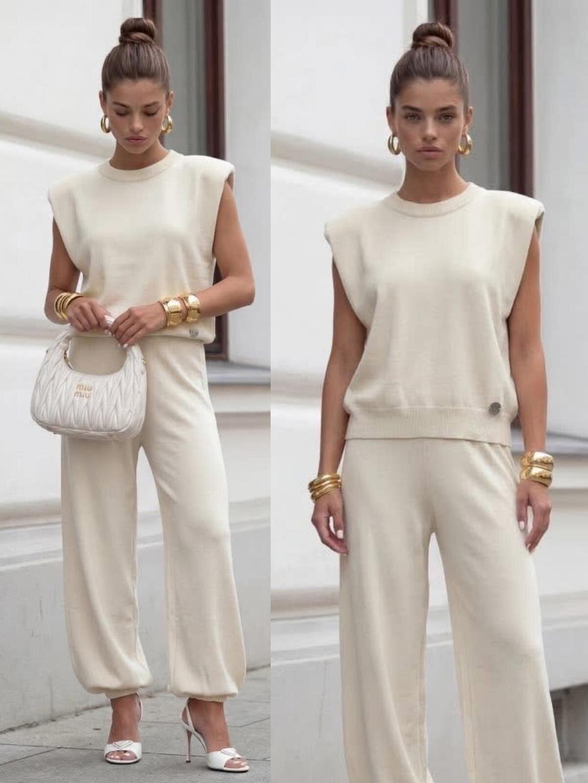Modna sweterkowa bluzka w formie bezrękawnika o krótszym fasonie, która nadaje stylizacji nowoczesnego charakteru. Poduszki na ramionach subtelnie podkreślają sylwetkę i dodają lekko strukturalnego efektu. Idealna do warstwowych outfitów na co dzień i na specjalne okazje.