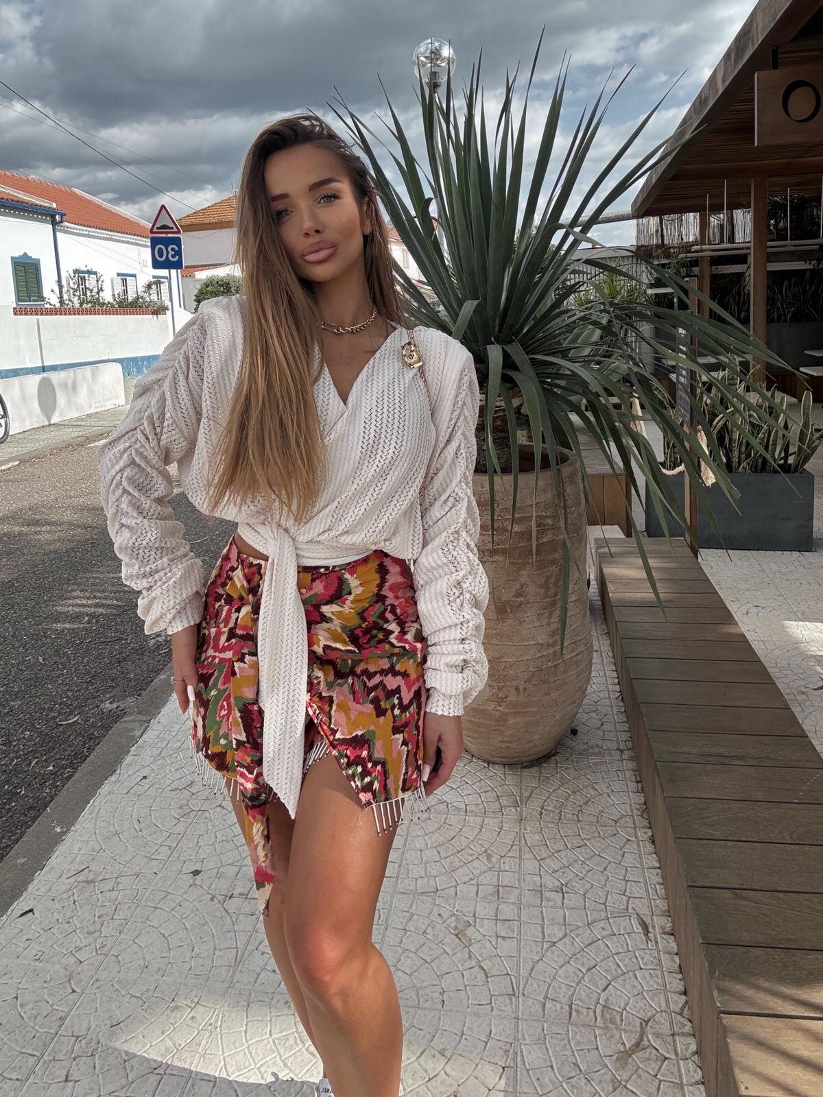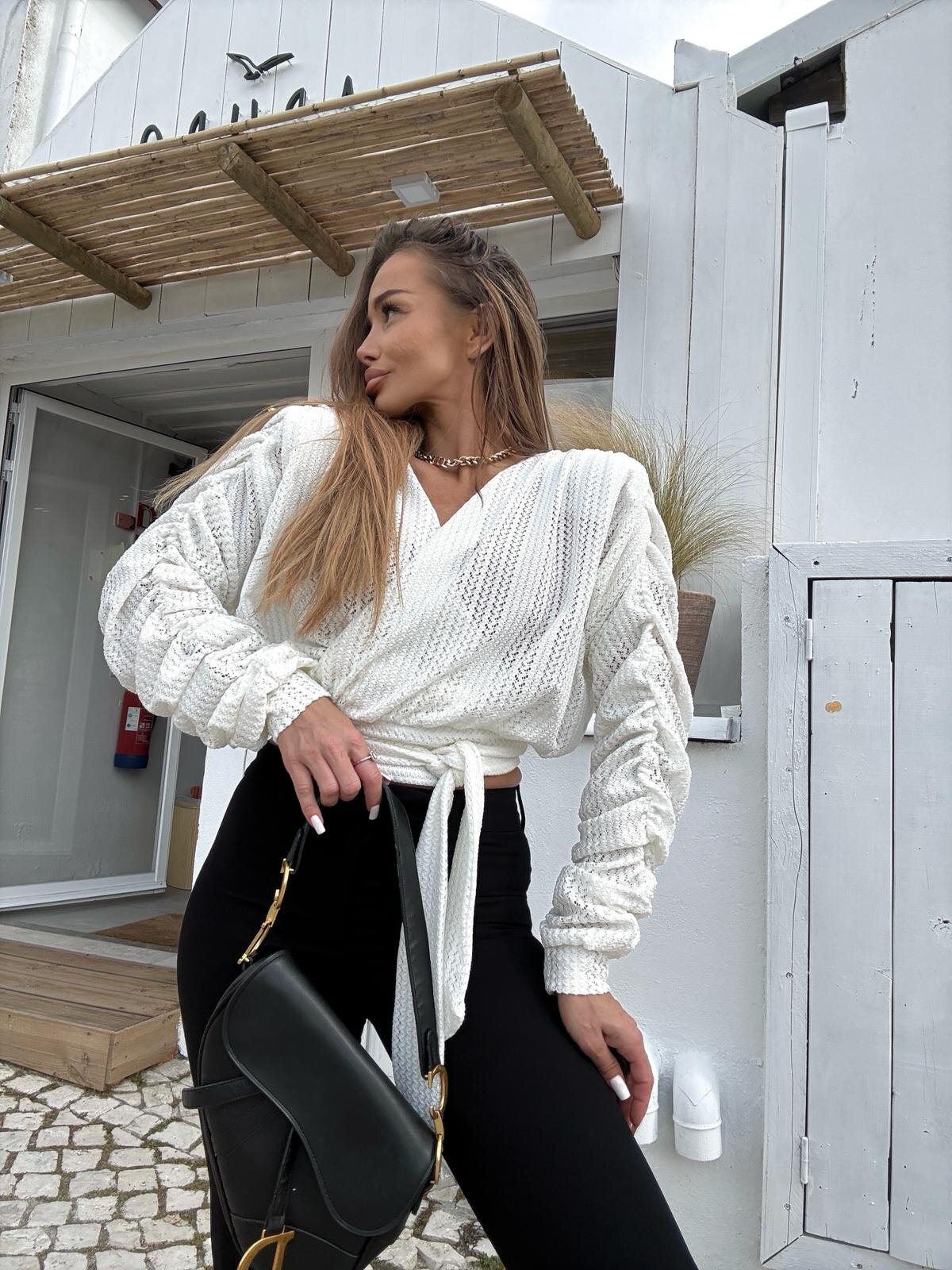 Wprowadź do swojej garderoby nutę luksusu i wyjątkowej tekstury z bluzką Soleil Society. Model zachwyca ażurową strukturą materiału, która nadaje całości lekkości i subtelnej elegancji. Efektownie marszczone, bufiaste rękawy tworzą nowoczesną linię ramion i przyciągają uwagę, a kopertowy dekolt w kształcie litery V pięknie podkreśla szyję i kobiece proporcje. Szerokie wiązanie w pasie pozwala idealnie dopasować bluzkę do sylwetki i zaznaczyć talię.