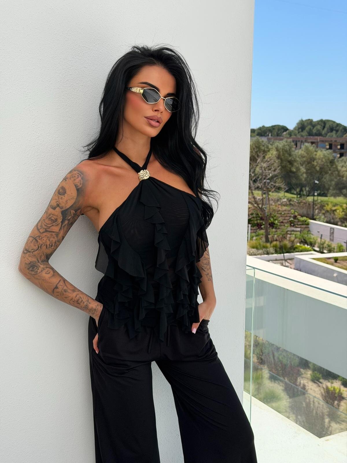 Efektowny top o kroju halter z kaskadowym układem pionowych falban. Unikalny design z ozdobną aplikacją przy szyi i zwiewnym materiałem tworzy luksusową bazę do wieczorowych oraz wizytowych stylizacji.