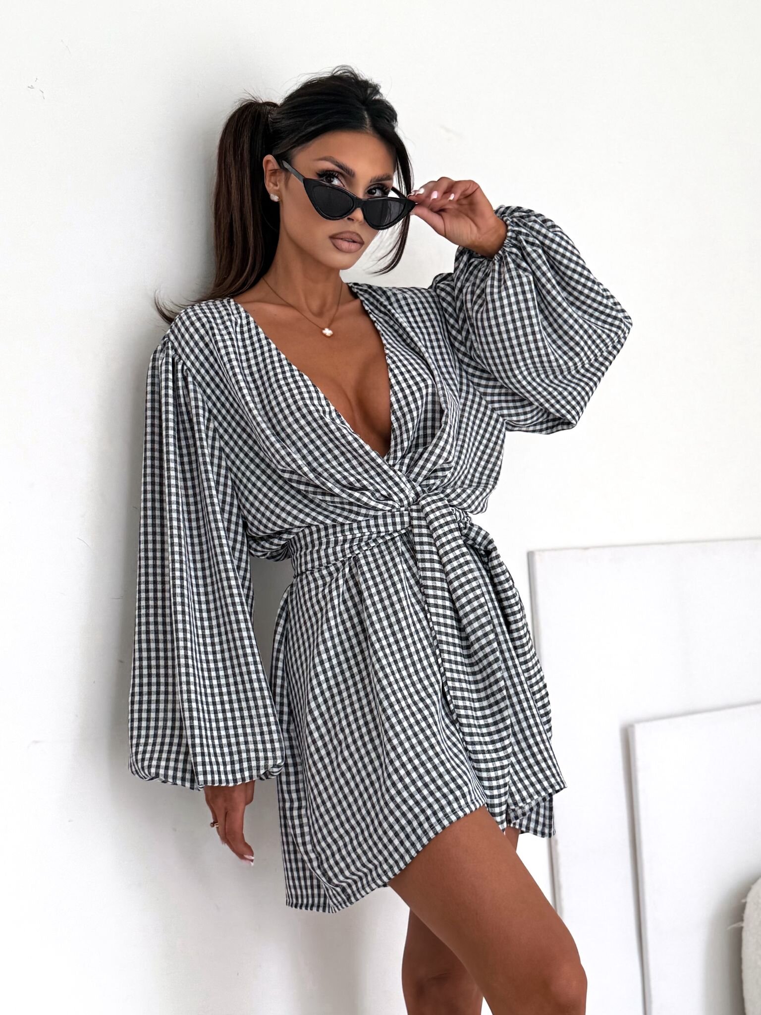 Kombinezon Lumene to połączenie dziewczęcego stylu i wygody w nowoczesnym wydaniu. Wykonany z wysokiej jakości tkaniny w klasyczny wzór kratki, posiada głęboki dekolt kopertowy oraz efektowne, bufiaste rękawy zakończone gumką. Wiązanie w talii umożliwia idealne dopasowanie i podkreśla sylwetkę. To świetna propozycja na letnie wyjścia, randki i spotkania w gronie znajomych.