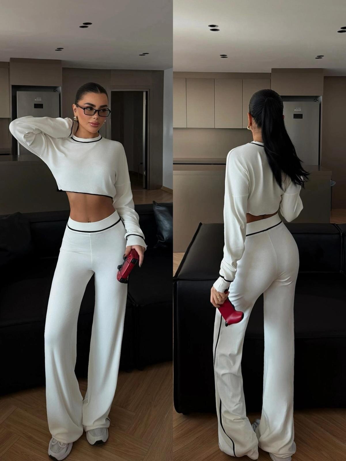 Komplet 2w1 Calerro to modny komplet damski wykonany z mi臋kkiej, przyjemnej w dotyku tkaniny, kt贸ry 艂膮czy wygod臋 z nowoczesnym designem. Spodnie z wysokim stanem i lu藕n膮 nogawk膮 zapewniaj膮 komfort oraz pi臋knie modeluj膮 sylwetk臋. Bluzka z d艂ugim r臋kawem nadaje ca艂o艣ci kobiecego charakteru, a kontrastuj膮ce wyko艅czenia podkre艣laj膮 wyj膮tkowy styl kompletu. Idealny na co dzie艅 i do modnych stylizacji casual.