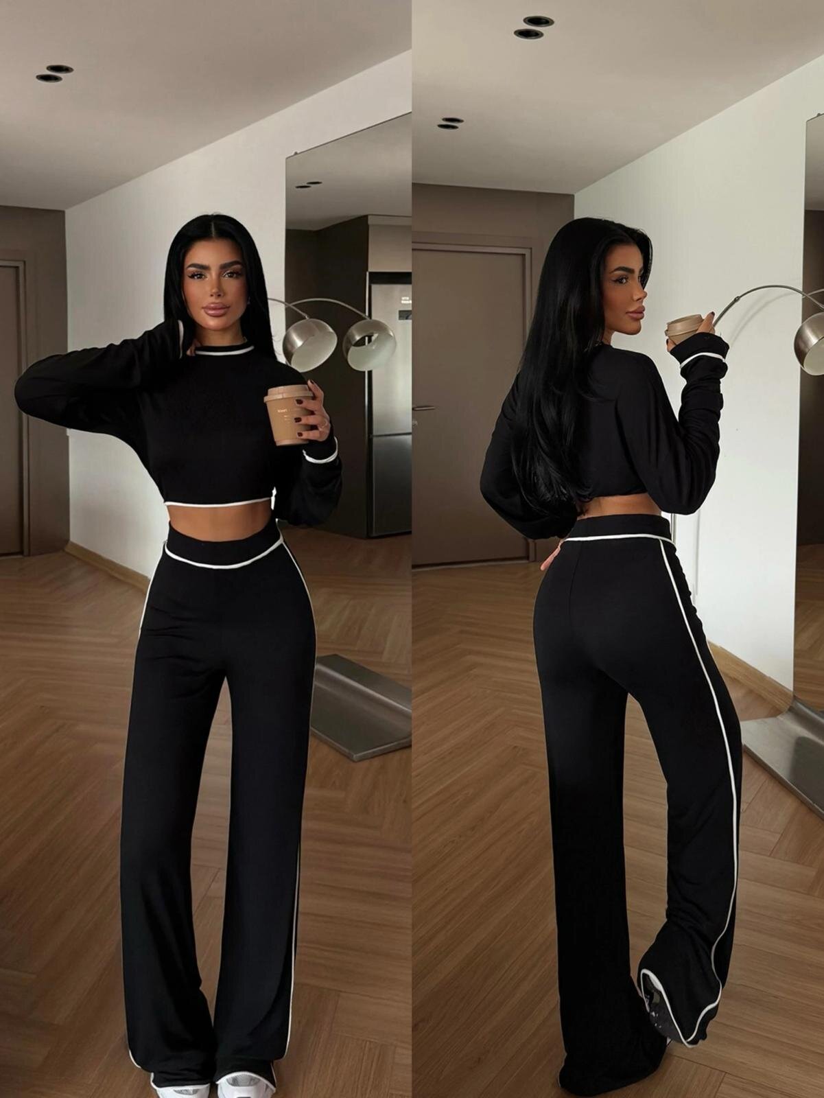 Komplet 2w1 Calerro to modny komplet damski wykonany z mi臋kkiej, przyjemnej w dotyku tkaniny, kt贸ry 艂膮czy wygod臋 z nowoczesnym designem. Spodnie z wysokim stanem i lu藕n膮 nogawk膮 zapewniaj膮 komfort oraz pi臋knie modeluj膮 sylwetk臋. Bluzka z d艂ugim r臋kawem nadaje ca艂o艣ci kobiecego charakteru, a kontrastuj膮ce wyko艅czenia podkre艣laj膮 wyj膮tkowy styl kompletu. Idealny na co dzie艅 i do modnych stylizacji casual.