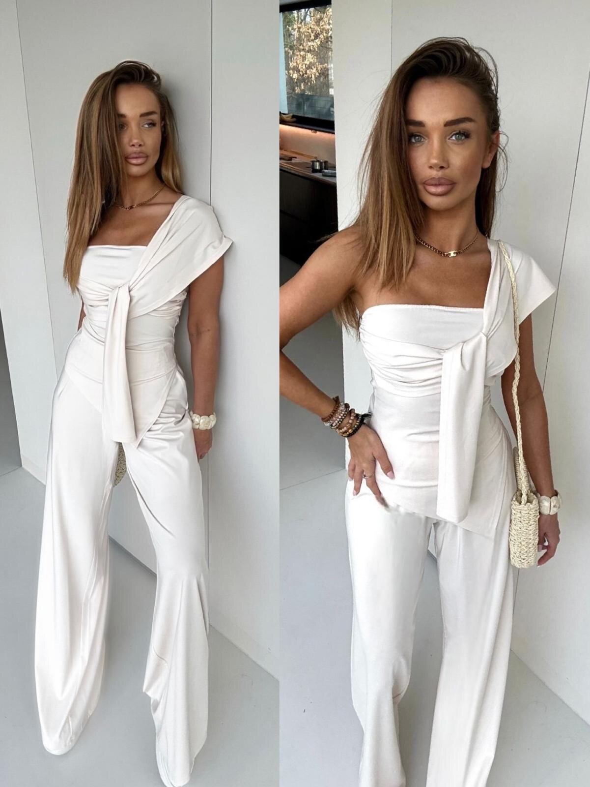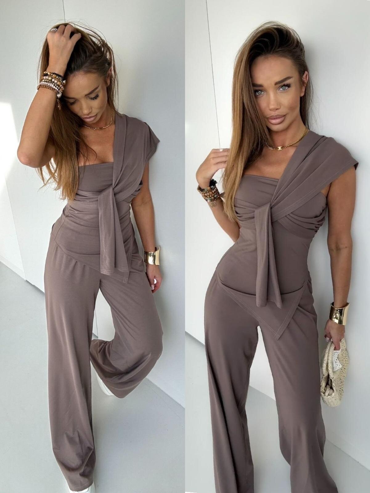 Komplet 2w1 Celly to modny i uniwersalny zestaw damski, idealny dla kobiet, które cenią styl, komfort i nowoczesny design. Zestaw składa się z spodni z szeroką nogawką, które wysmuklają i wydłużają sylwetkę, oraz bluzki z asymetrycznym przodem. Efektowna dekoracja na jedno ramię dodaje stylizacji wyjątkowej elegancji i charakteru, tworząc efektowny wygląd. Ten zestaw 2w1 świetnie sprawdzi się na eleganckie i casualowe wyjścia, łącząc wygodę z nowoczesnym stylem.