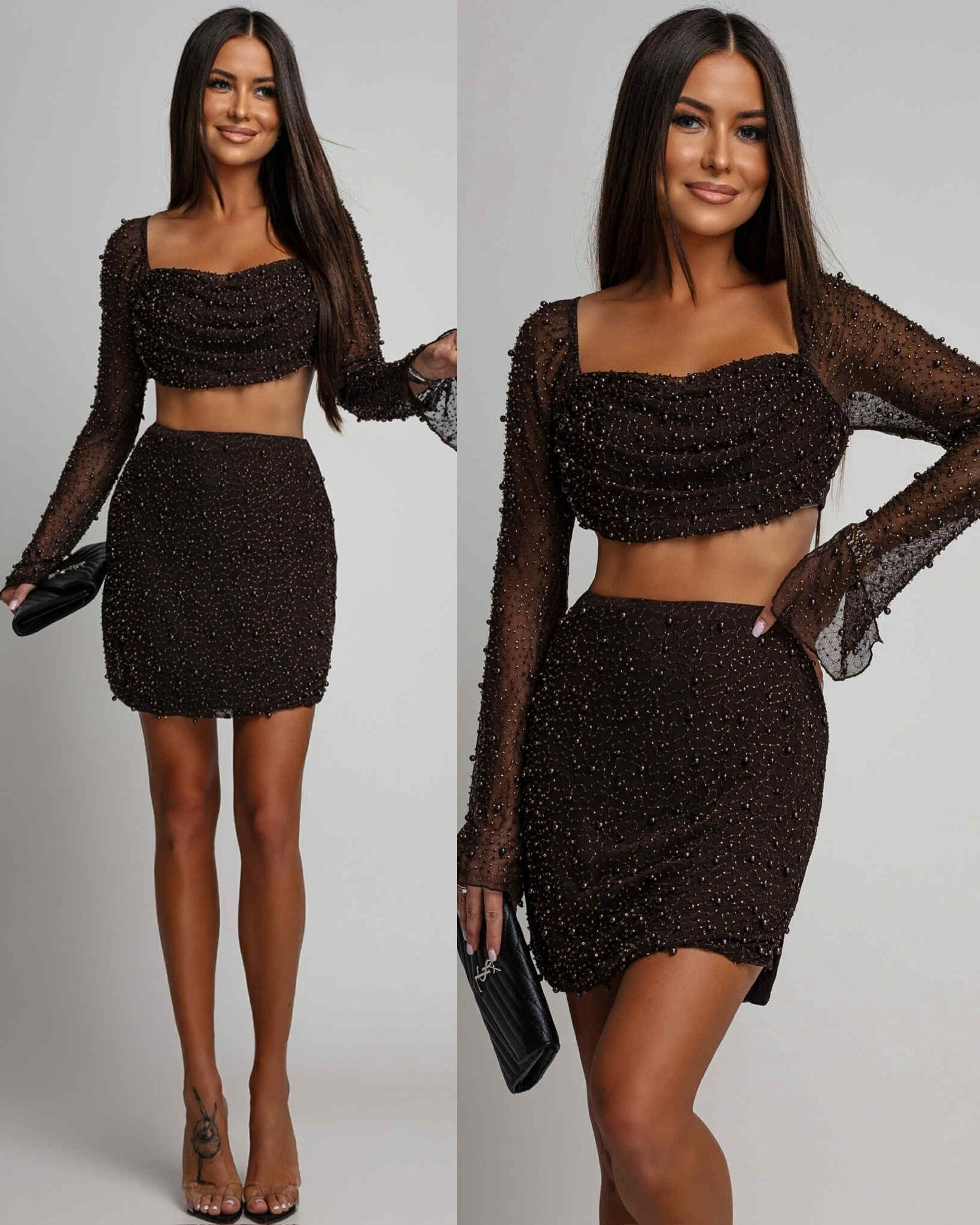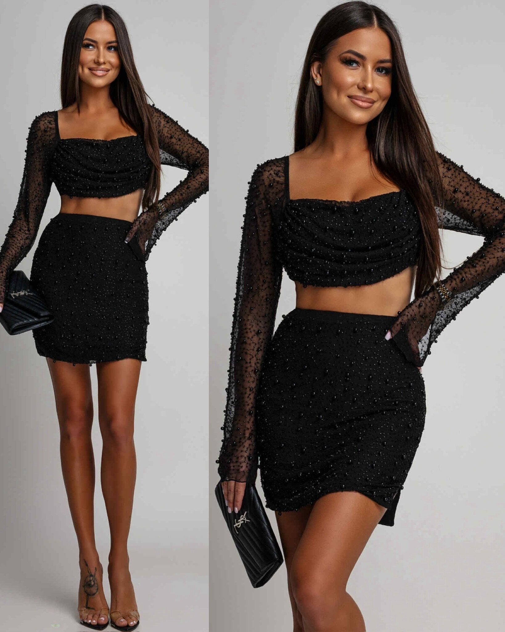Top + spódniczka o perełkowym wykończeniu, długość mini. Top posiada zapięcie na zamek z tyłu oraz miseczki na biust. Spódniczka zapinana na zamek po boku.