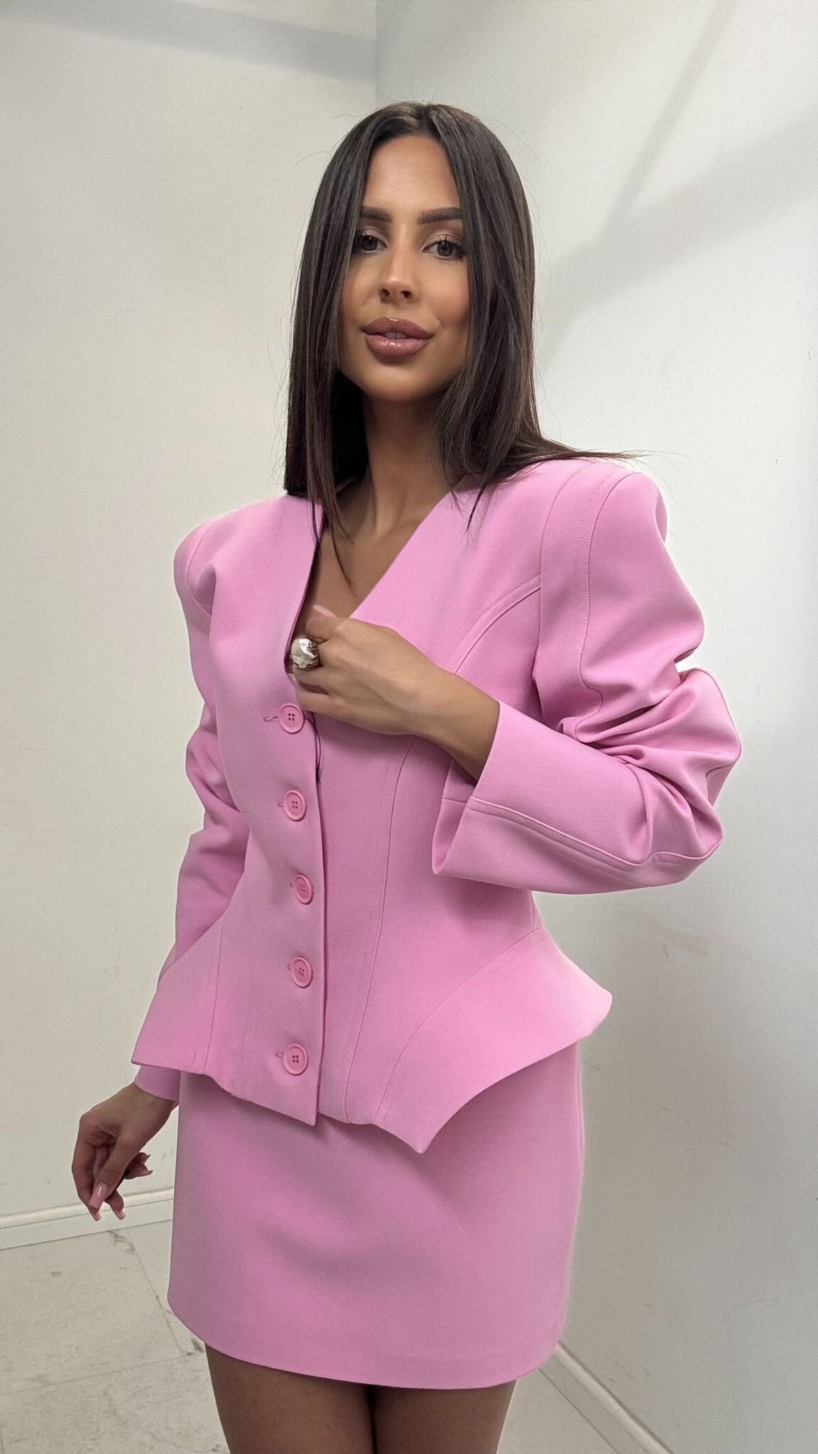 Postaw na wyrafinowan膮 elegancj臋 z kompletem 2w1 Lario. Ten stylowy zestaw sk艂ada si臋 z taliowanej marynarki oraz dopasowanej sp贸dnicy mini, tworz膮c sp贸jny i niezwykle kobiecy look. Marynarka o gorsetowym kroju z efektown膮 baskink膮 perfekcyjnie modeluje sylwetk臋, a strukturalne ramiona nadaj膮 ca艂o艣ci nowoczesnego charakteru. To idealna propozycja na uroczyste spotkania i eleganckie wyj艣cia.