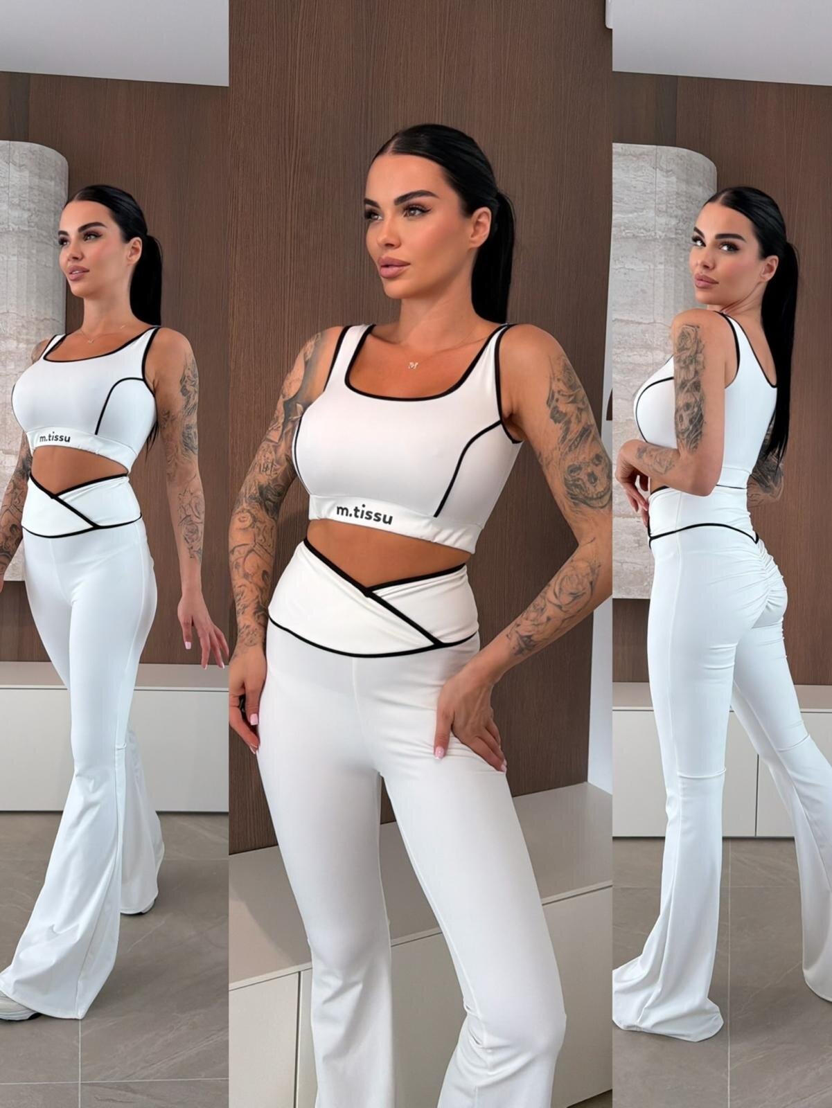 Komplet 2w1 Pilates to modny zestaw sportowy składający się z dopasowanego topu i legginsów z rozszerzaną nogawką. Elastyczny materiał idealnie dopasowuje się do sylwetki, zapewniając wygodę podczas pilatesu, jogi, fitnessu oraz codziennych aktywności.