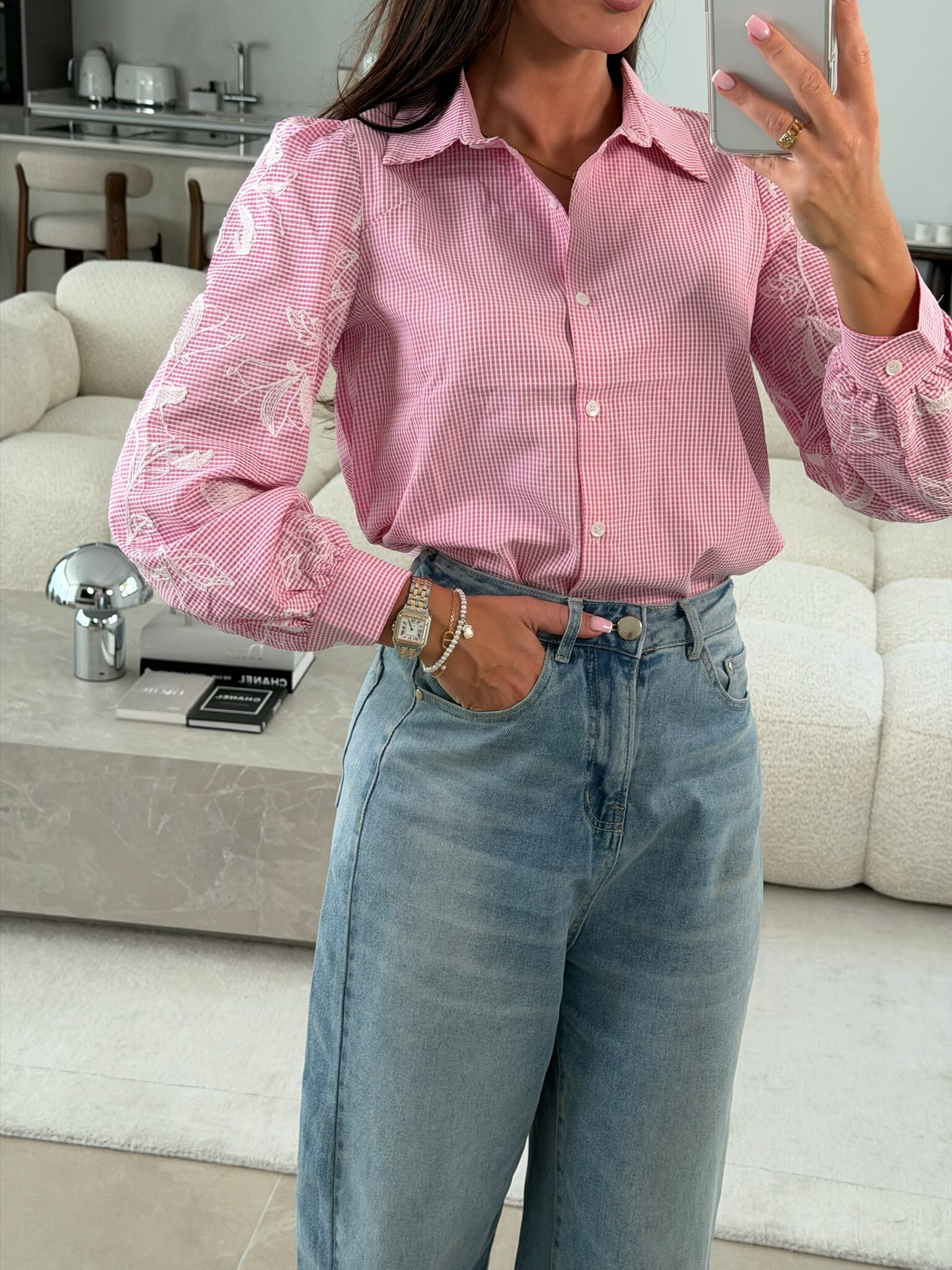 Postaw na modny, casualowy look z naszą koszulą w drobną kratę! Luźniejszy fason i lekko bufiaste długie rękawy zapewniają wygodę i kobiecy charakter, a zapinanie na guziki ułatwia codzienne noszenie. Dodatkowym detalem są ozdobne hafty na rękawach, które dodają koszuli subtelnej elegancji i wyjątkowego stylu. Idealna do jeansów, spódnic czy szortów, tworząc stylizacje casual i smart casual.