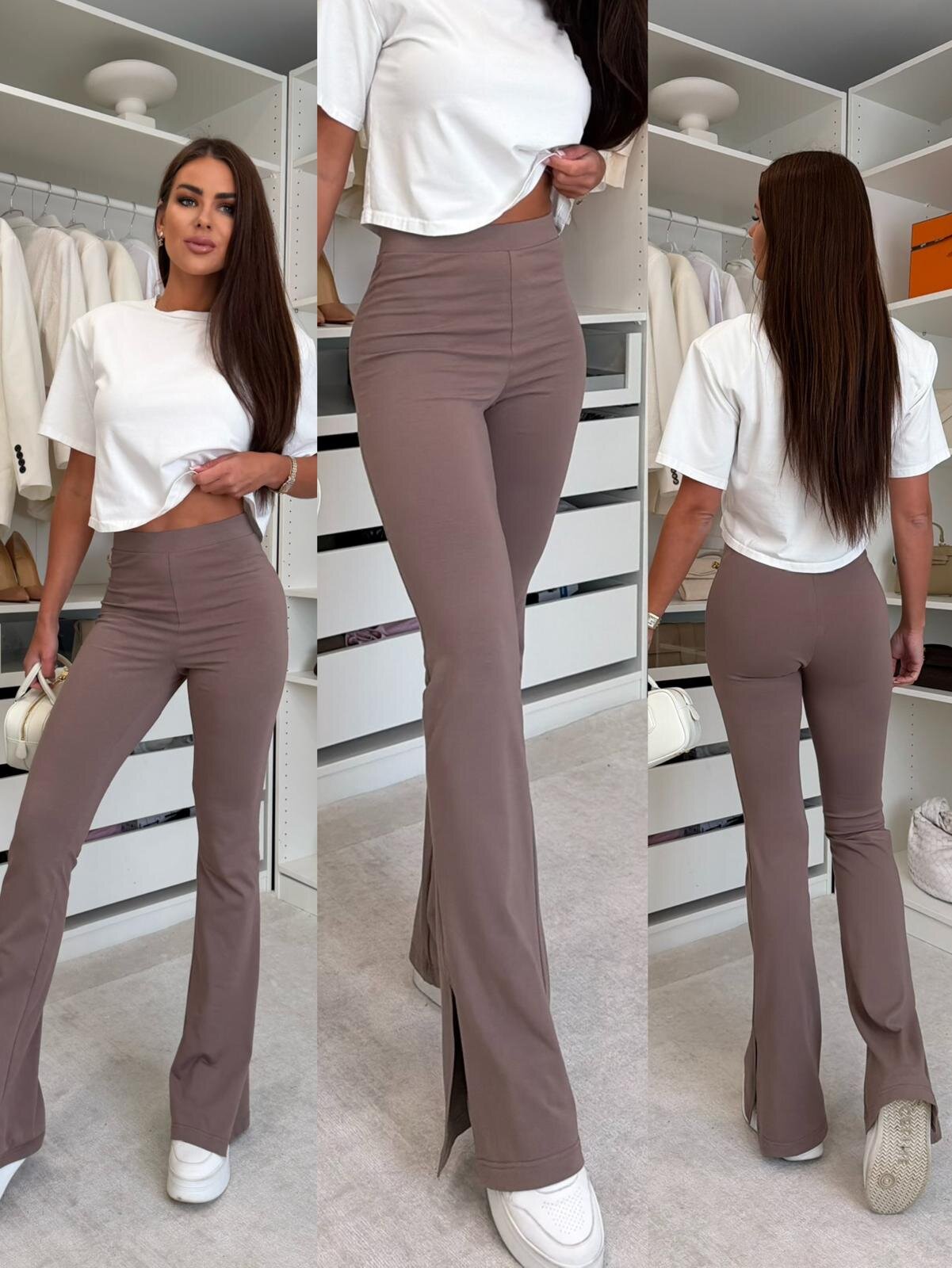 Wykonanie z gładkiej tkaniny, dopasowany krój z rozciętą nogawką. Wysoki stan.