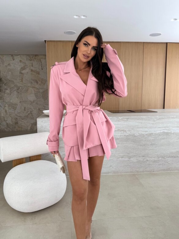 Marynarka o eleganckim kroju, kieszonki na przodzie Marynatka posiada podszewkę oraz poduszki na ramionach. Materiałowy pasek w zestawie.