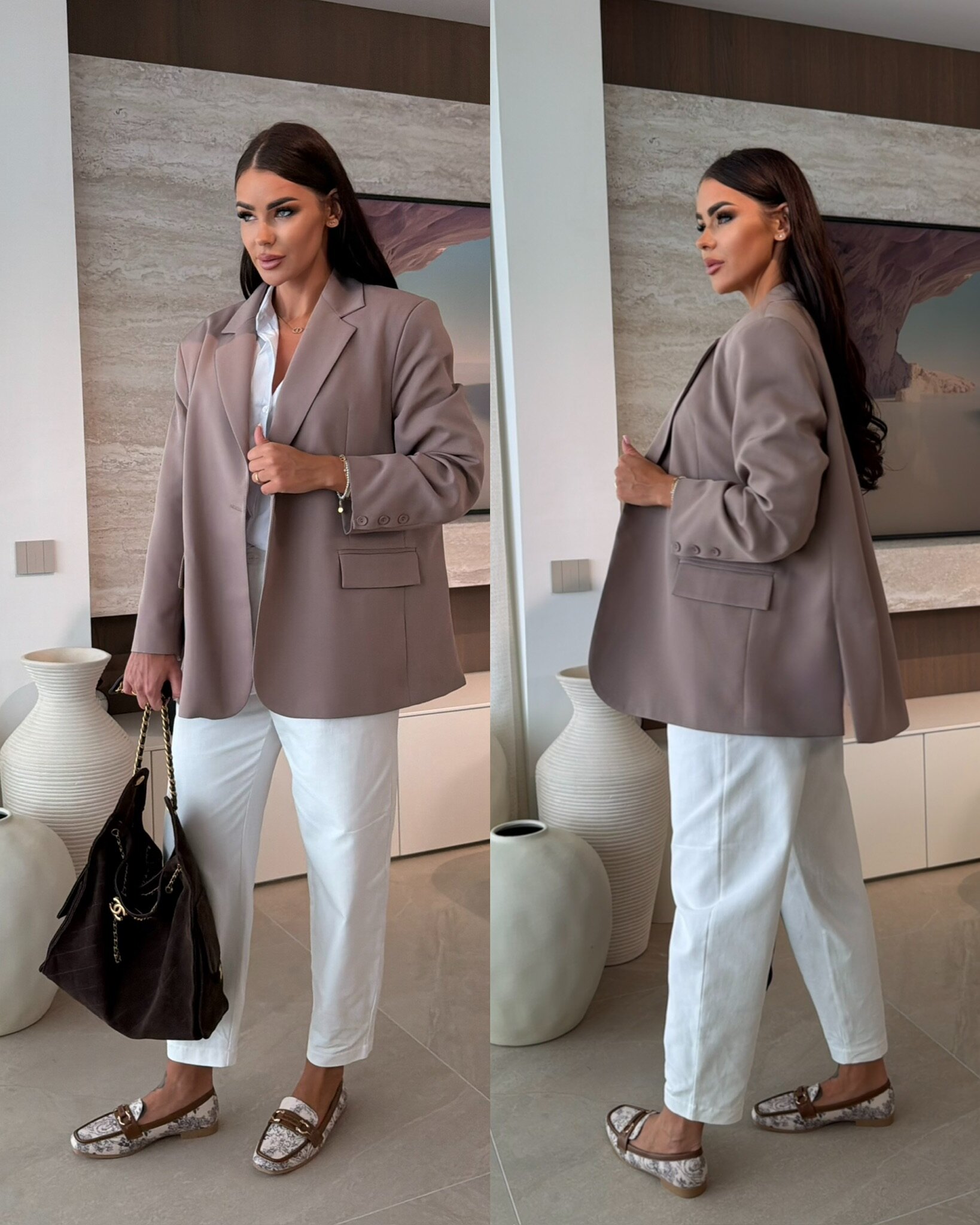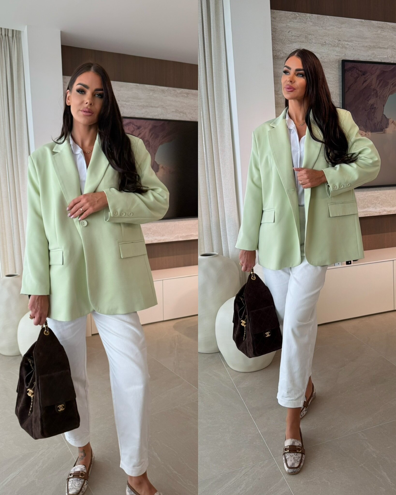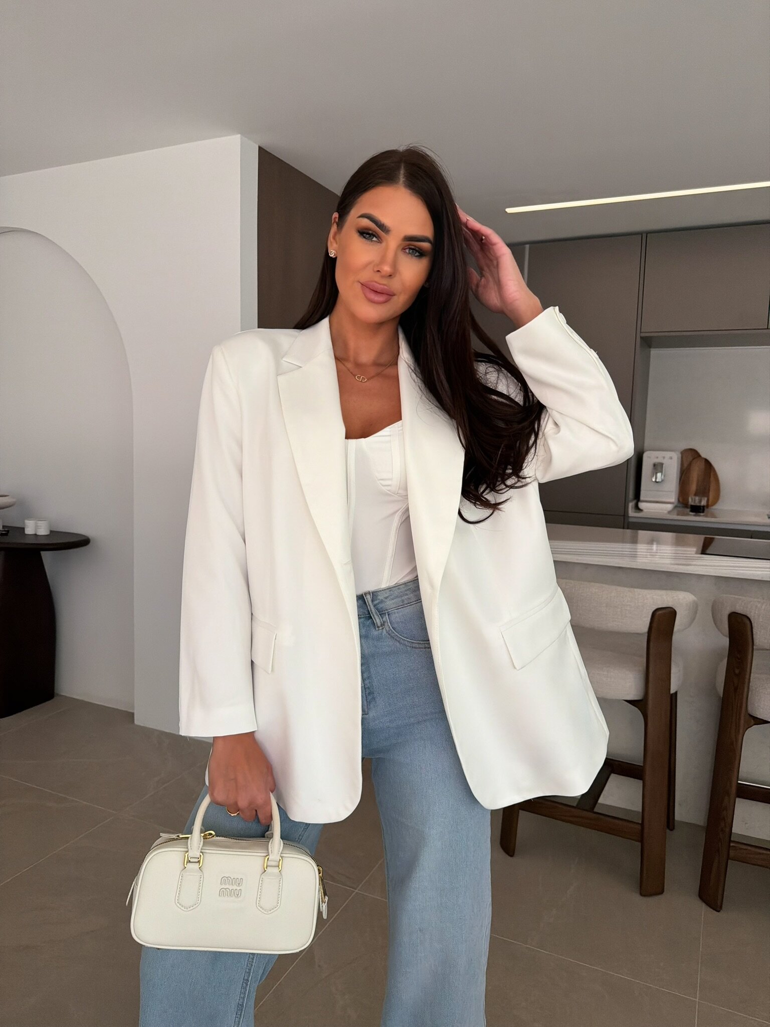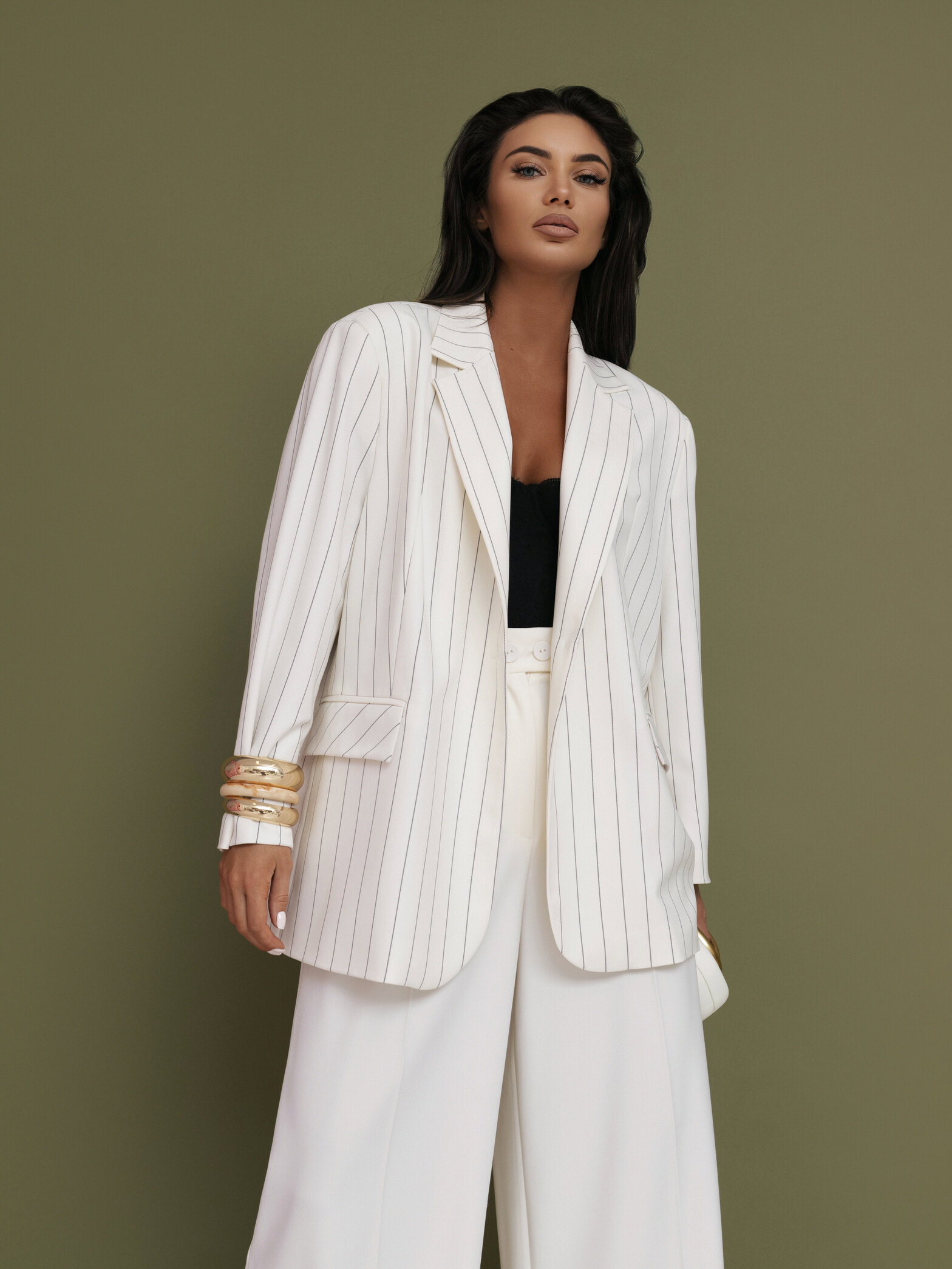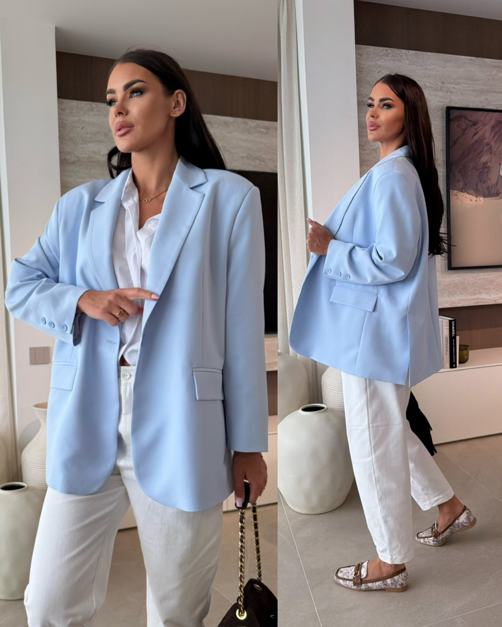 Prosty krój, gładkie wykończenie materiału. Kieszonki z klapami. Guziczki przy rękawach. Marynarka posiada podszewkę oraz wszyte poduszki na ramionach.