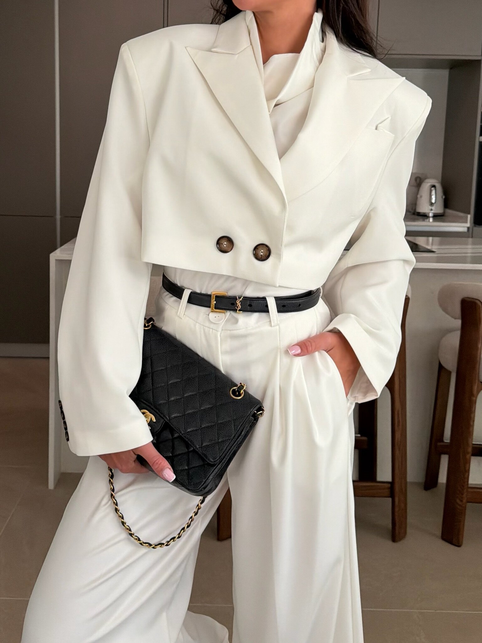 Kr贸tszy kr贸j oraz wykonanie z dba艂o艣ci膮 o najmniejsze detale. Regulacja dwurz臋dowym zapi臋ciem. Poduszki na r臋kawach oraz taliowany kr贸j. Pasek w zestawie.