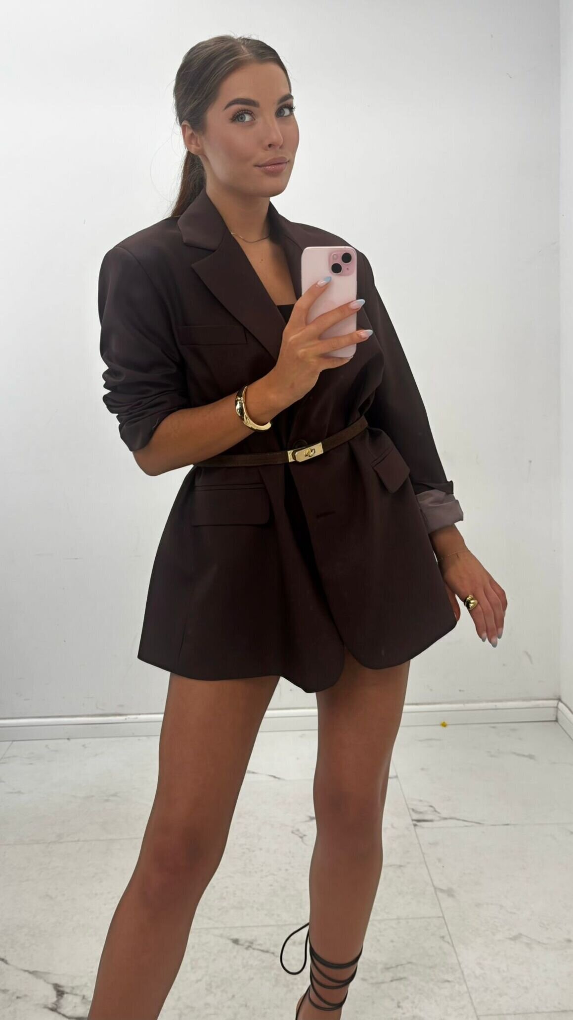 Gładkie wykończenie, elegancki design, oversize'owy fason. Zapięcie regulowane na guziki. Marynarka posiada podszewkę oraz poduszki na ramionach. Pasek nie jest w zestawie.