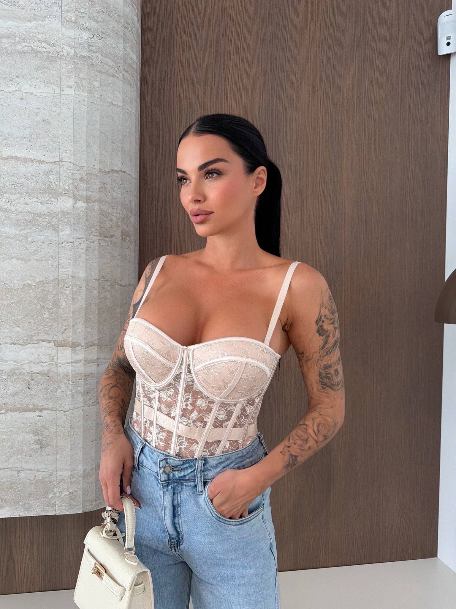 Gorset Solarie to kobiecy model wykonany z delikatnej koronki o subtelnym wzorze. Posiada usztywniane miseczki oraz pionowe przeszycia, które nadają mu klasycznej, gorsetowej formy. To idealna baza pod marynarkę, łącząca bieliźniany szyk z nowoczesnym designem.