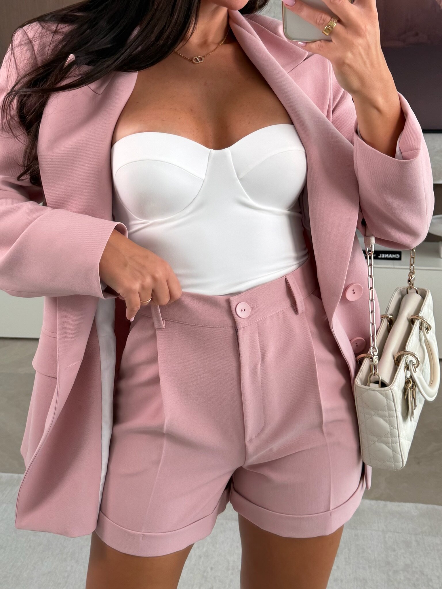 Eleganckie r贸偶owe szorty damskie o klasycznym kroju, idealne do stylizacji formalnych i smart casual. 艢wietnie komponuj膮 si臋 z marynark膮, tworz膮c stylowy komplet.