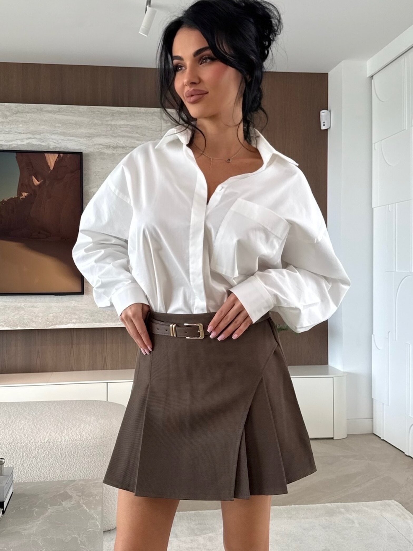 Stylowe sp贸dniczko-szorty 艂膮cz膮 wygod臋 szort贸w z elegancj膮 sp贸dnicy, tworz膮c modn膮 i uniwersaln膮 propozycj臋 na ka偶d膮 okazj臋. W zestawie znajduje si臋 pasek, kt贸ry podkre艣la tali臋, a podszewka zapewnia komfort noszenia. Plisowanie materia艂u nadaje lekko艣ci i nowoczesnego charakteru. Modny fason sprawia, 偶e sp贸dniczko-szorty 艣wietnie sprawdz膮 si臋 zar贸wno w casualowych, jak i bardziej eleganckich stylizacjach.