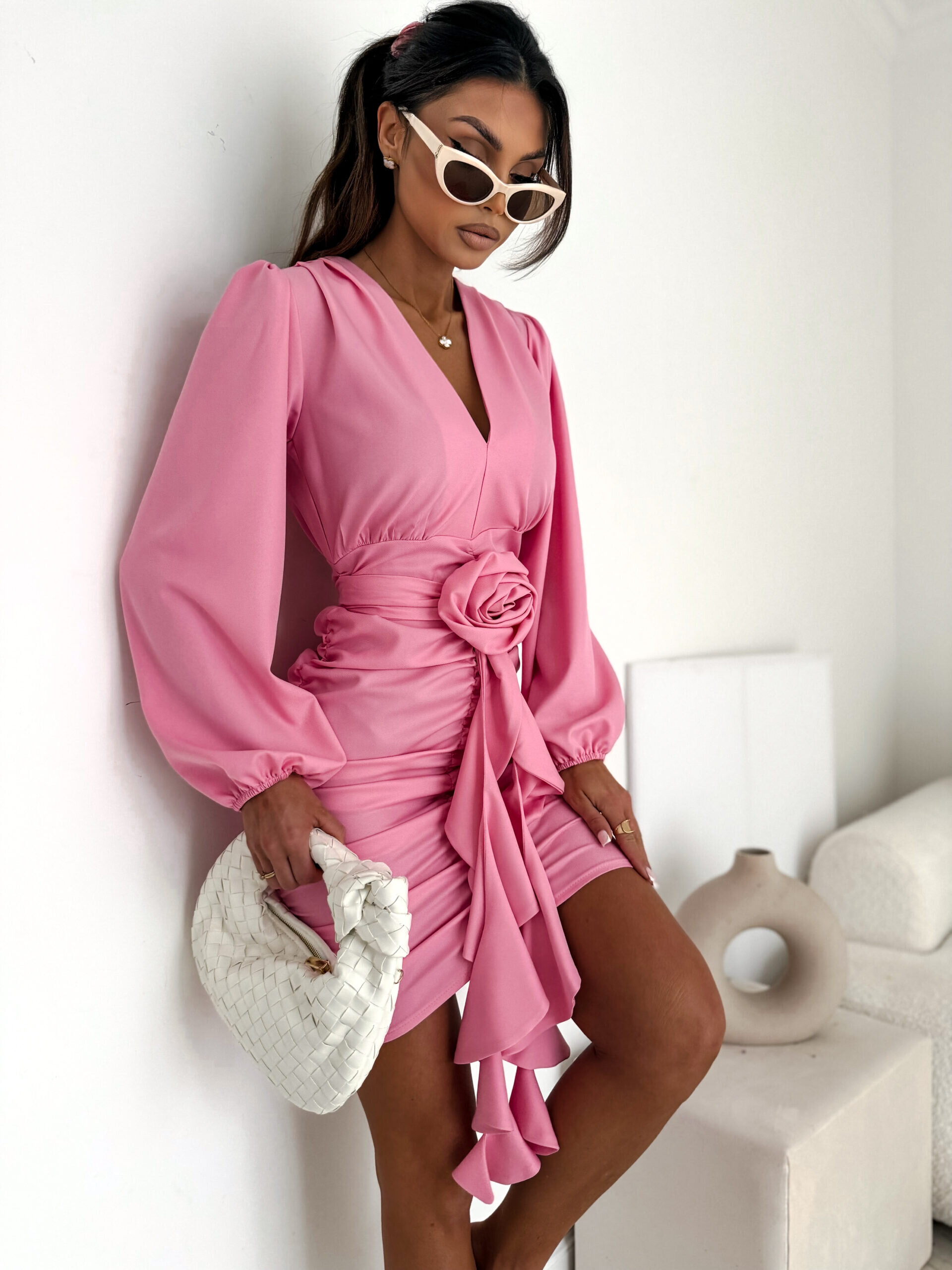 Sukienka Borella to elegancka i kobieca propozycja stworzona z myślą o wyjątkowych wyjściach. Jej dopasowany krój pięknie podkreśla sylwetkę, a subtelny połysk materiału dodaje klasy. Największym atutem modelu jest ozdobny pasek z efektowną różą, który jest dołączony do zestawu i pozwala podkreślić talię w wyjątkowy sposób. Długie rękawy oraz delikatne marszczenia sprawiają, że sukienka prezentuje się niezwykle szykownie.
