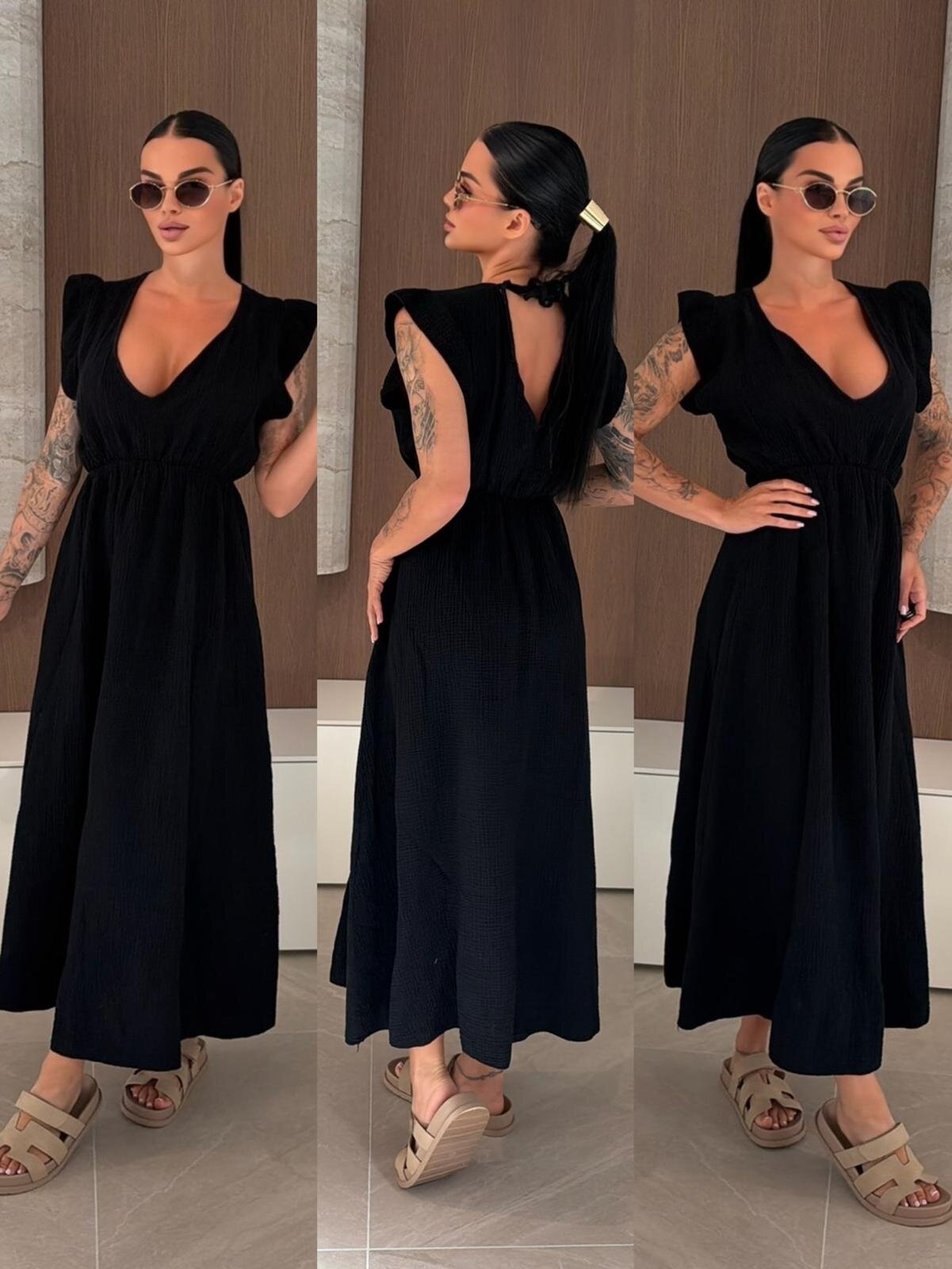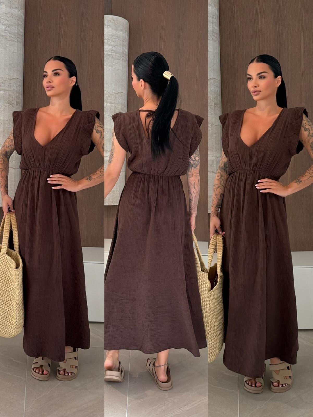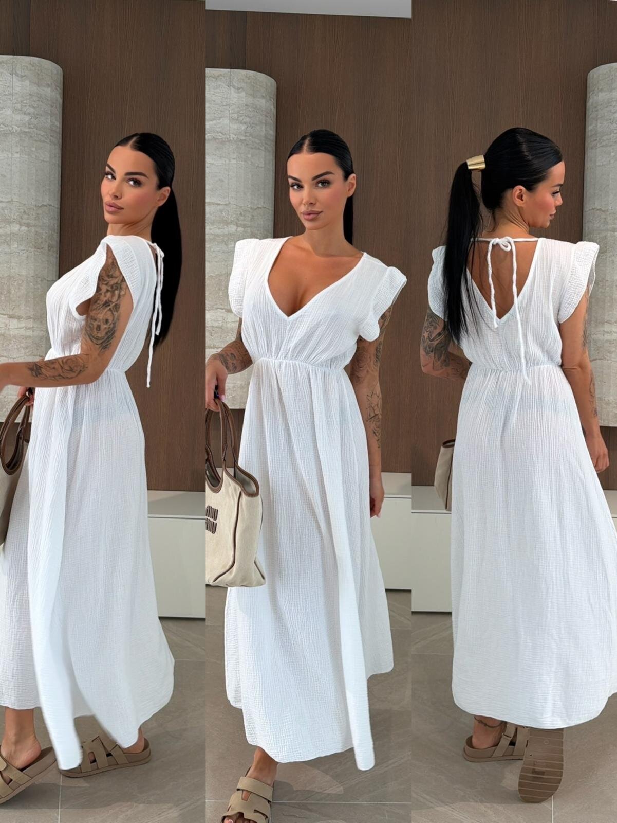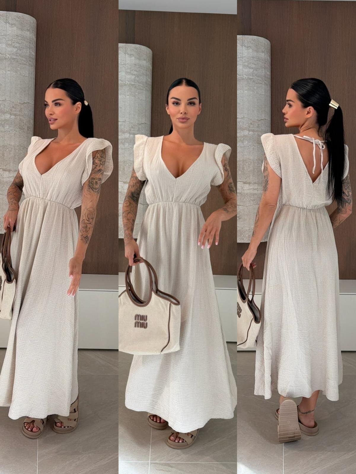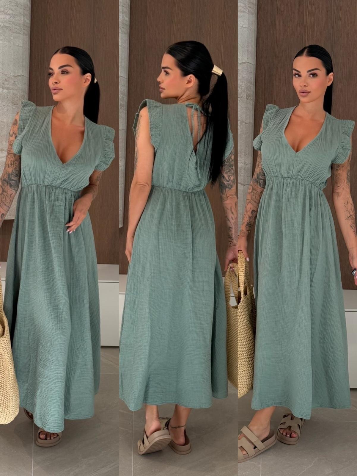 Sukienka maxi muślinowa to lekka i przewiewna propozycja idealna na ciepłe dni. Luźny fason z dekoltem V oraz wiązaniem przy szyi zapewnia swobodę i kobiecy wygląd, a gumka w talii subtelnie podkreśla sylwetkę. Doskonała do codziennych i wakacyjnych stylizacji.