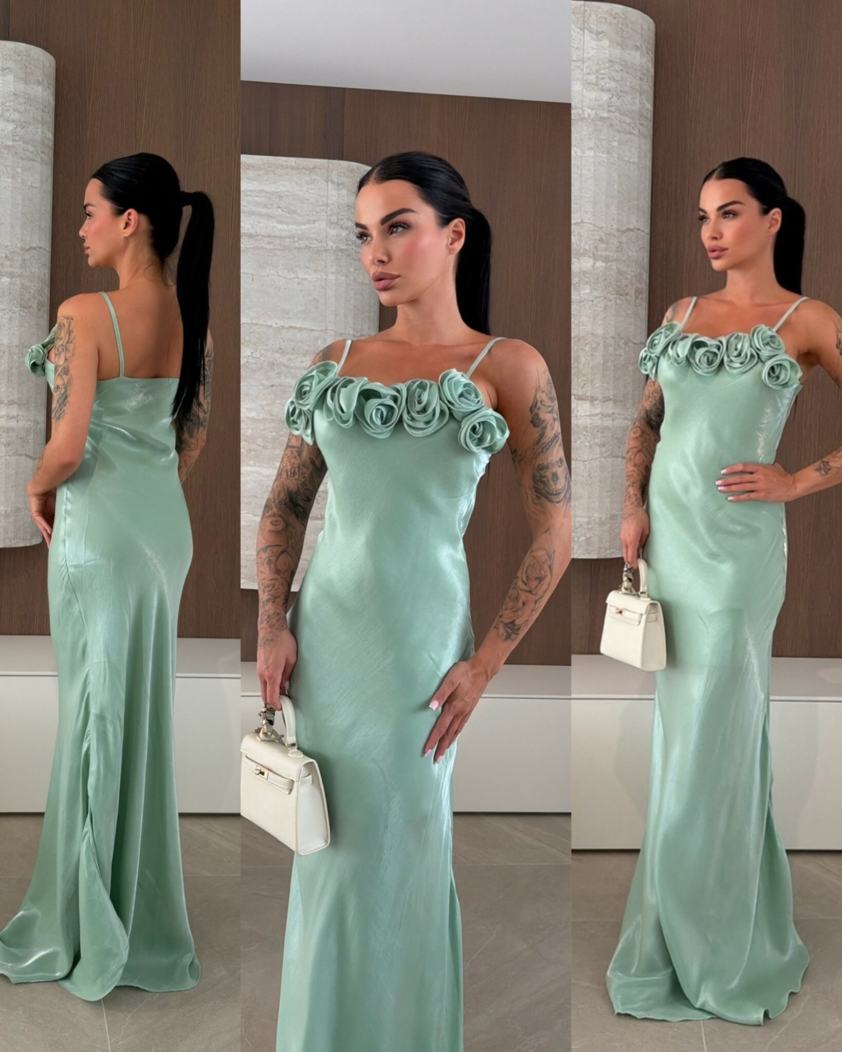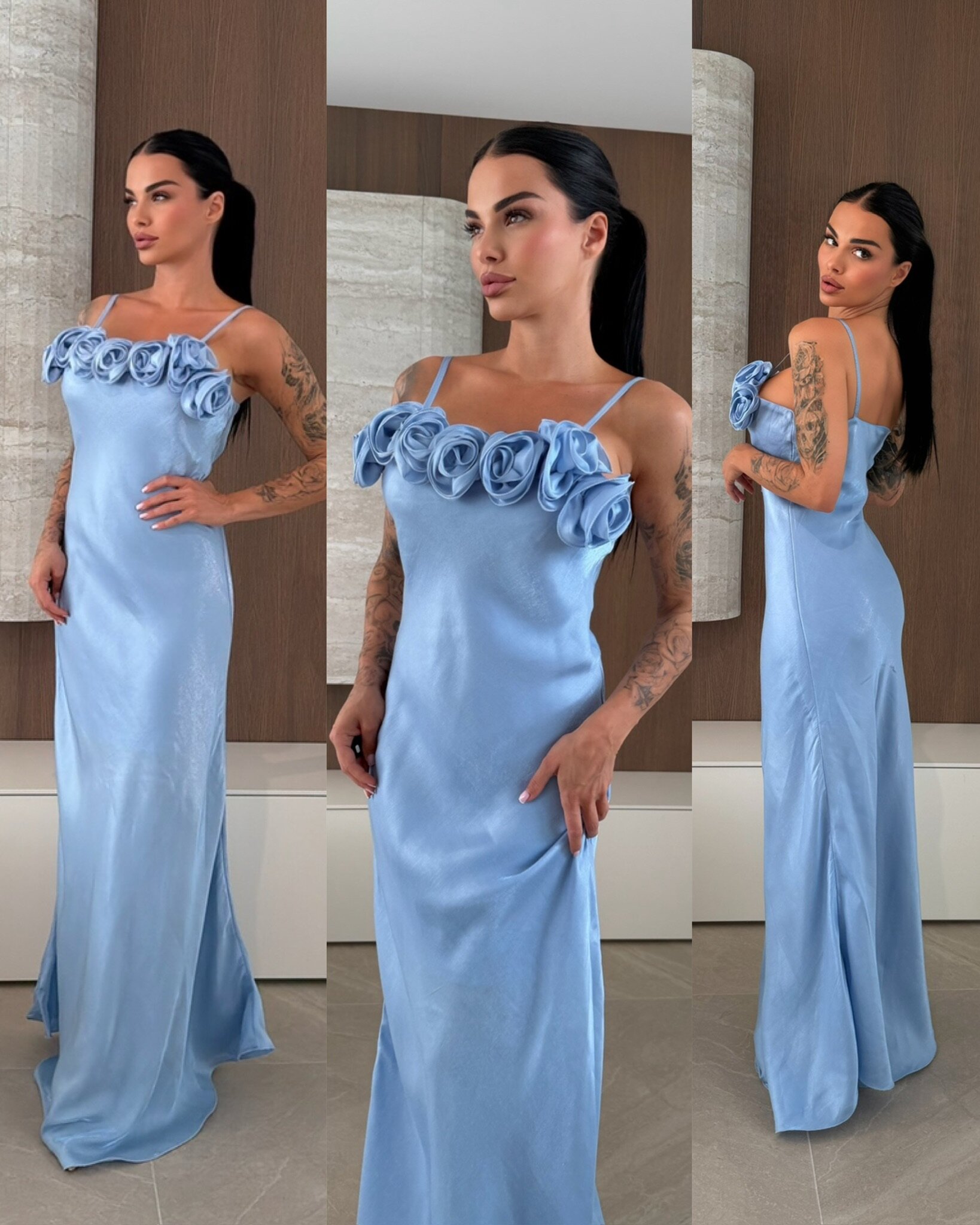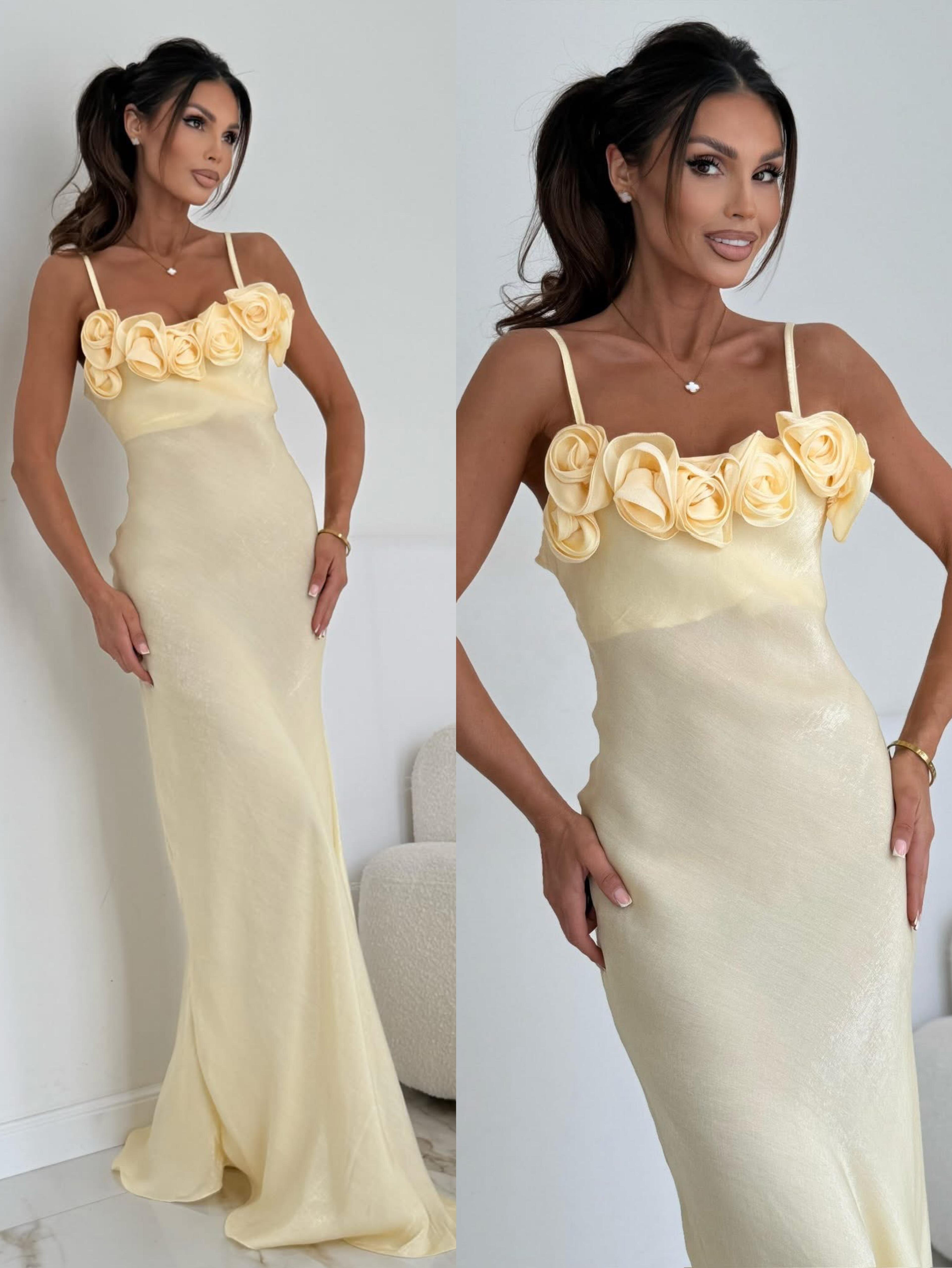 Długa, elegancka sukienka o prostym, dopasowanym kroju. Górna część ozdobiona jest efektownymi kwiatami, co nadaje jej romantyczny i dekoracyjny charakter. Sukienka jest na cienkich ramiączkach, co podkreśla lekkość i subtelność całości.