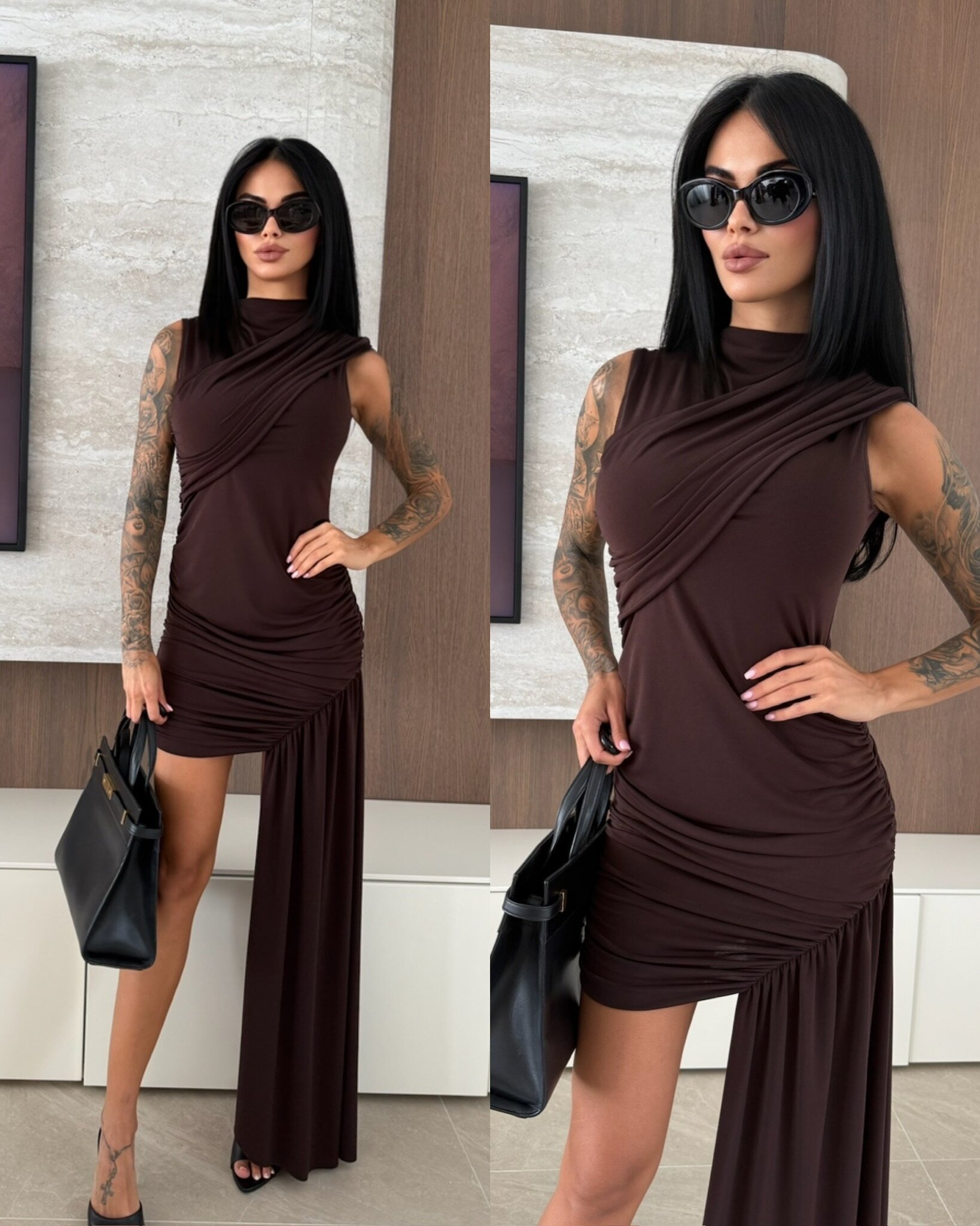 Zachwyć elegancją i modowym wyczuciem! Ta wyjątkowa sukienka mini to idealna propozycja na ważne wyjścia, gdzie chcesz wyglądać zjawiskowo. Dopasowany krój z efektownym drapowaniem w okolicach dekoltu i bioder subtelnie podkreśla kobiecą sylwetkę, a długi, lekko opadający tren z przodu dodaje całości niepowtarzalnego charakteru. Półgolf nadaje sukience szyku i nowoczesnego akcentu. To model, który z pewnością przyciągnie spojrzenia.