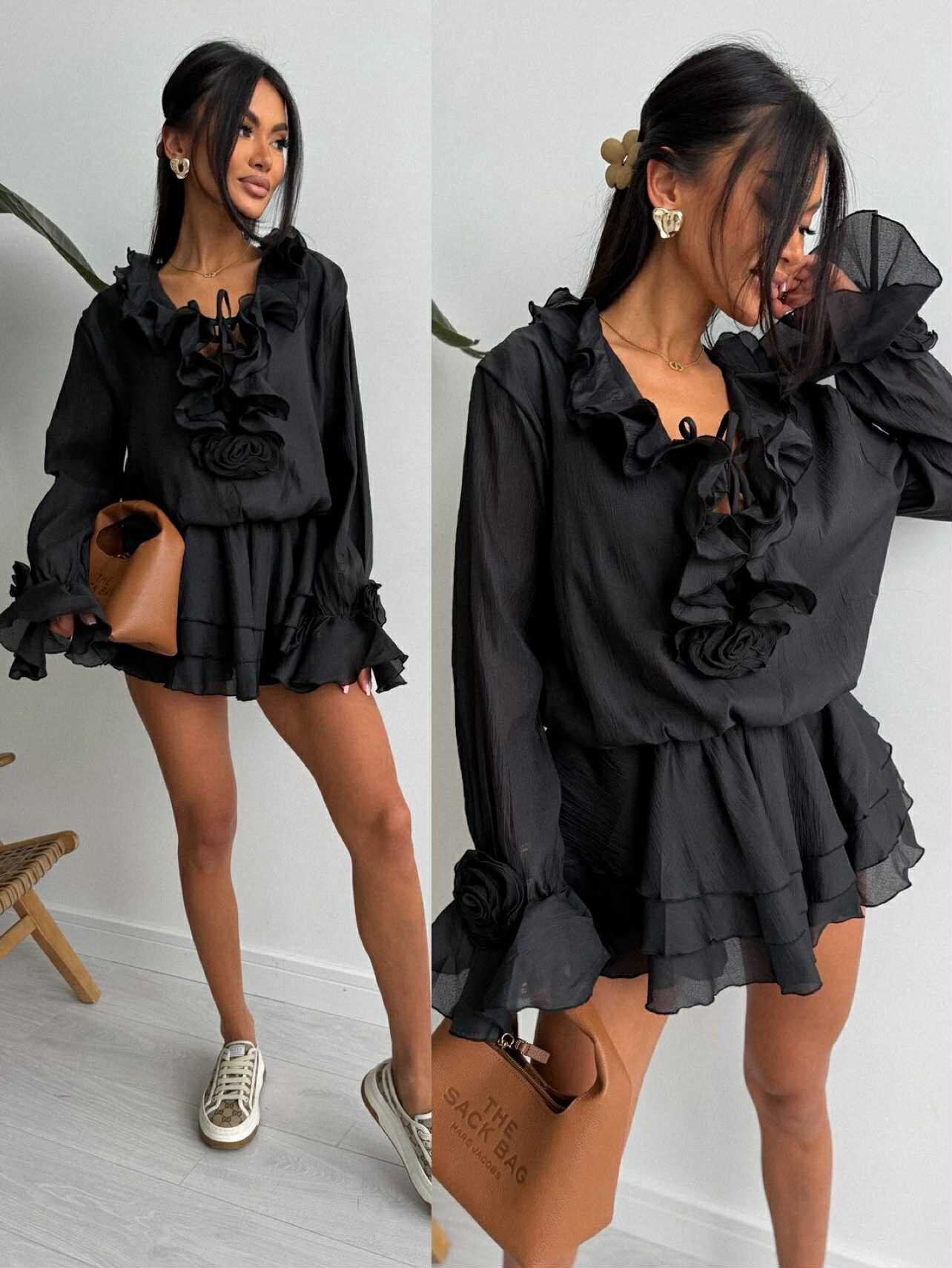 Romantyczna sukienka Odessi mini o zwiewnym kroju, z efektownymi falbanami i delikatnym wiązaniem przy dekolcie. Lekka, kobieca i idealna na wiosenno-letnie okazje – od przyjęć po stylowe wyjścia.