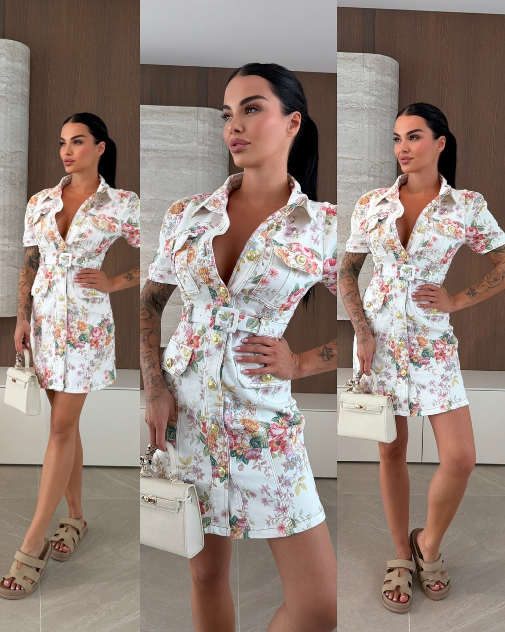Elegancka mini sukienka jeansowa o dopasowanym fasonie, idealna na codzienne i casualowe stylizacje. zdobiona pozłacanymi guzikami na całej długości oraz subtelnym kwiatowym printem, z krótkim rękawem dla letniego komfortu.