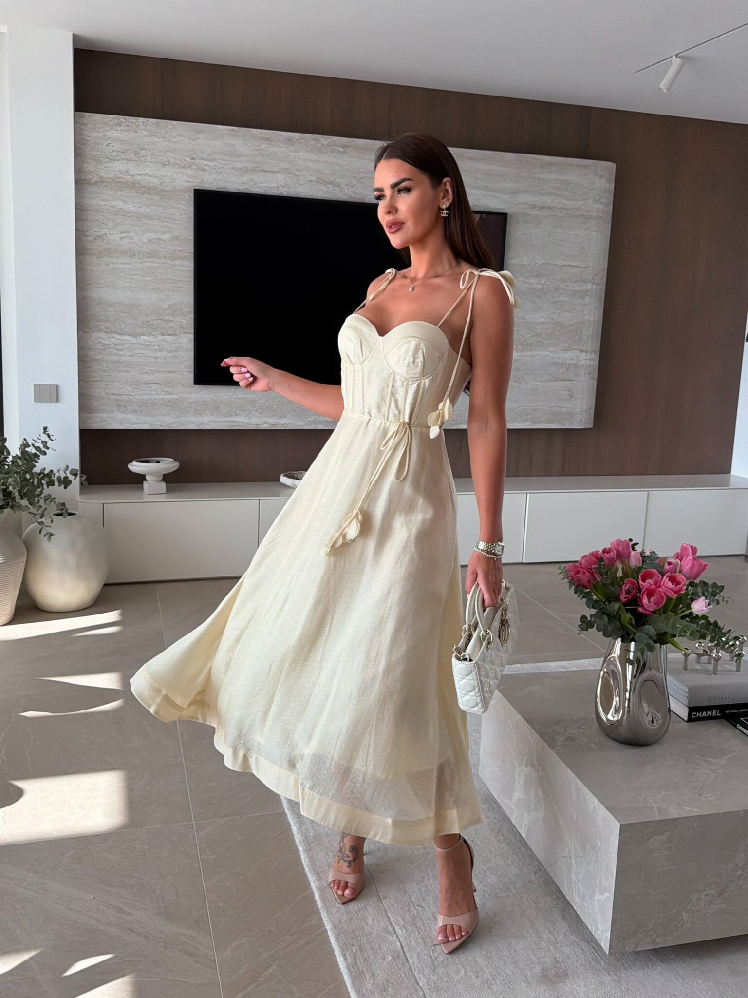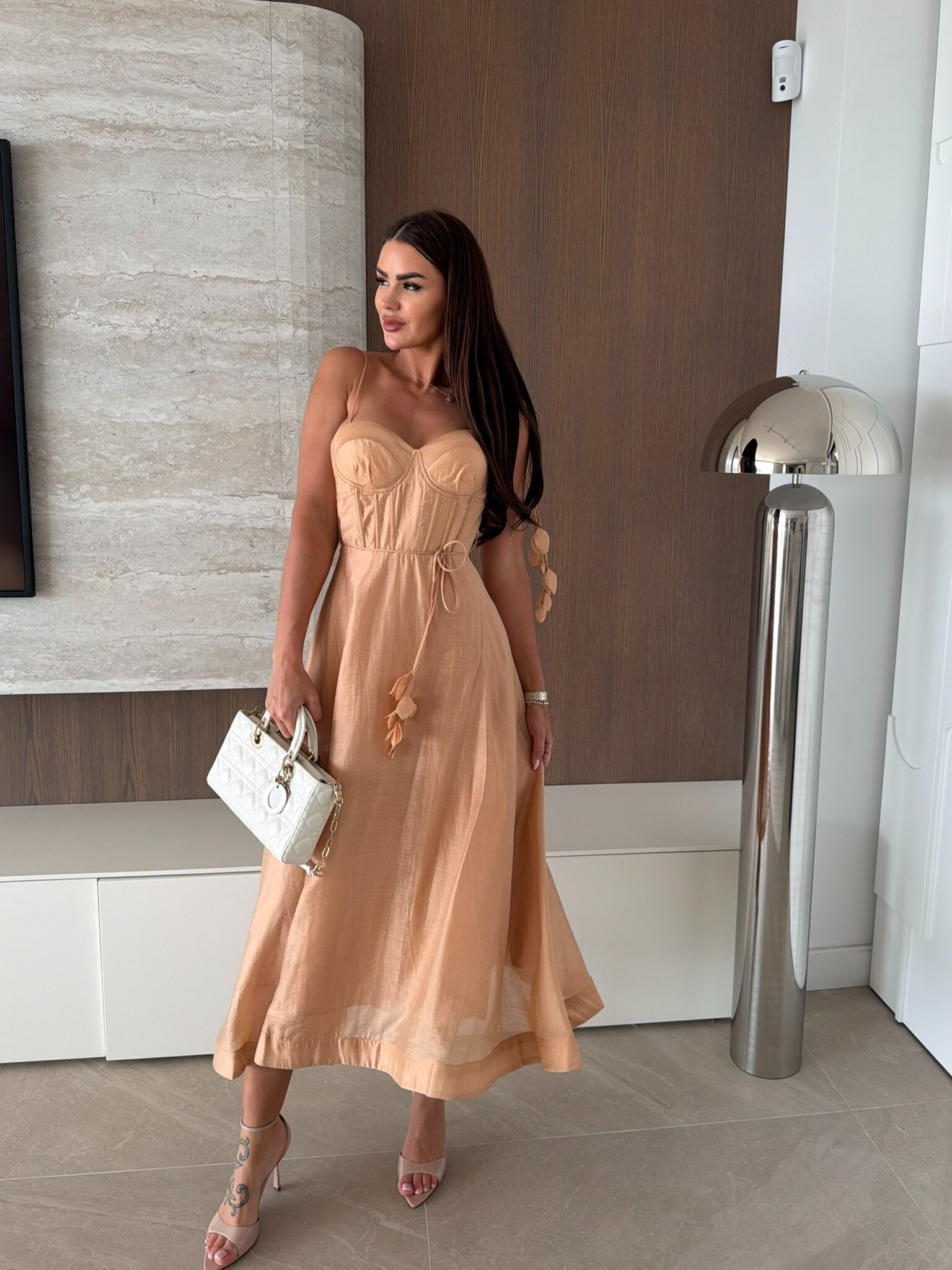 Sukienka midi z gorsetową górą i lekko usztywnionymi miseczkami to idealne połączenie elegancji i kobiecego komfortu. Od talii materiał delikatnie się rozchodzi, tworząc lekko puszczony, zwiewny dół. Ozdobne wiązanie z kwiatkami dodaje sukience subtelnego uroku i romantycznego charakteru. Doskonała propozycja na wesela, przyjęcia i specjalne okazje, która podkreśla sylwetkę i dodaje lekkości stylizacji.