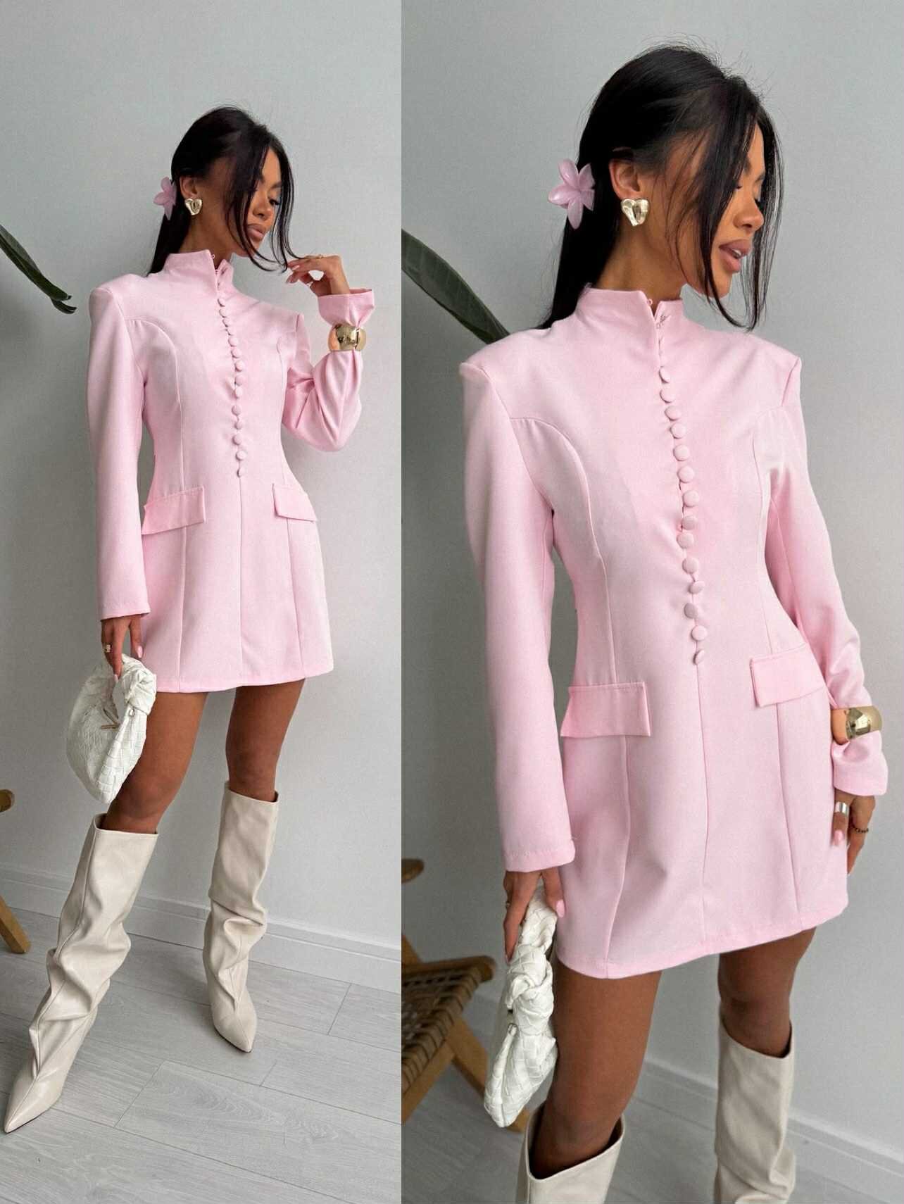 Elegancka sukienka Torri mini o dopasowanym, marynarkowym kroju. Zabudowany dekolt, ozdobne guziki i wyraźnie podkreślona talia nadają całości szyku i nowoczesnej kobiecości. Idealna na wyjątkowe wyjścia, spotkania czy stylowe okazje dzienne.
