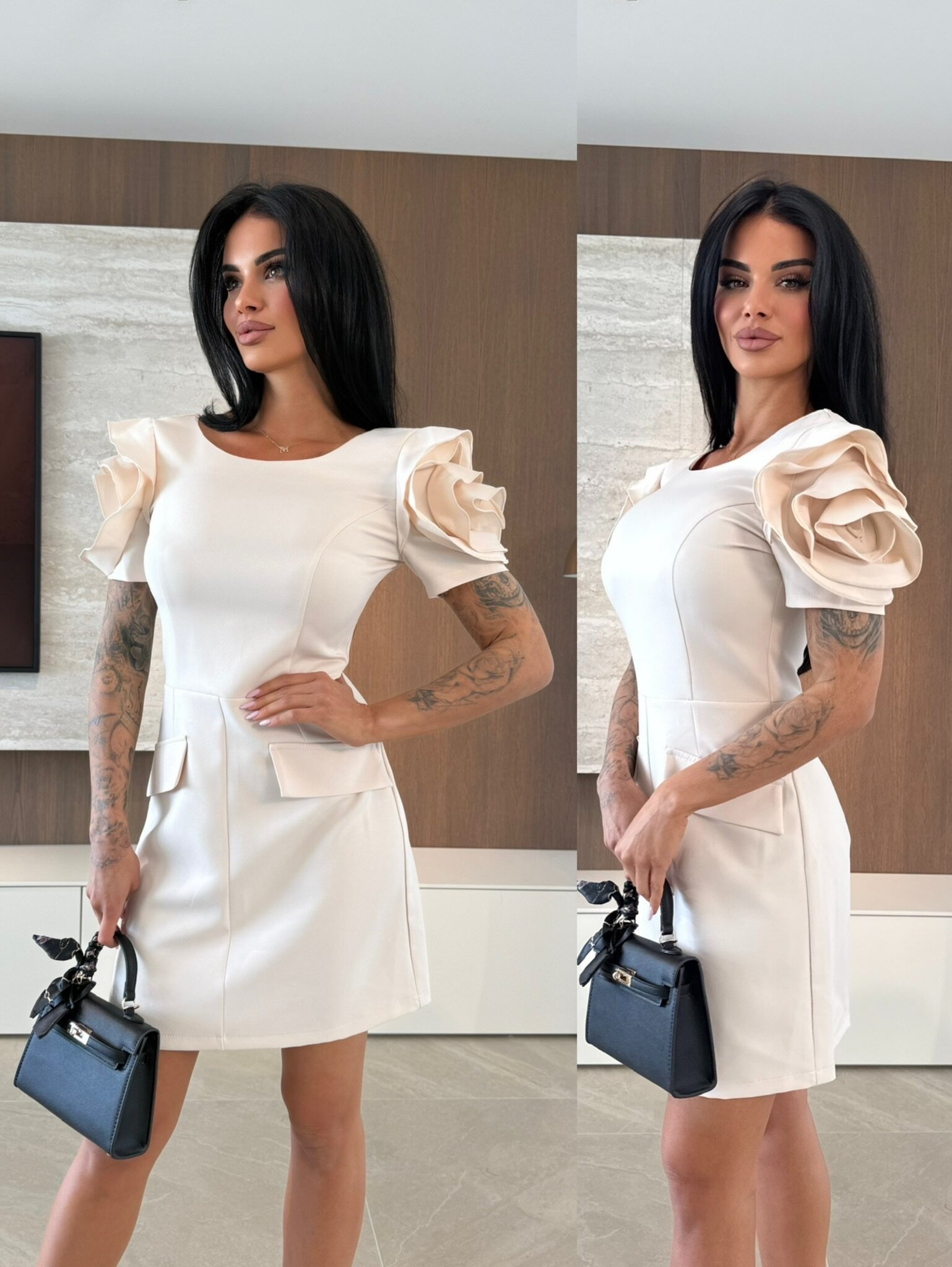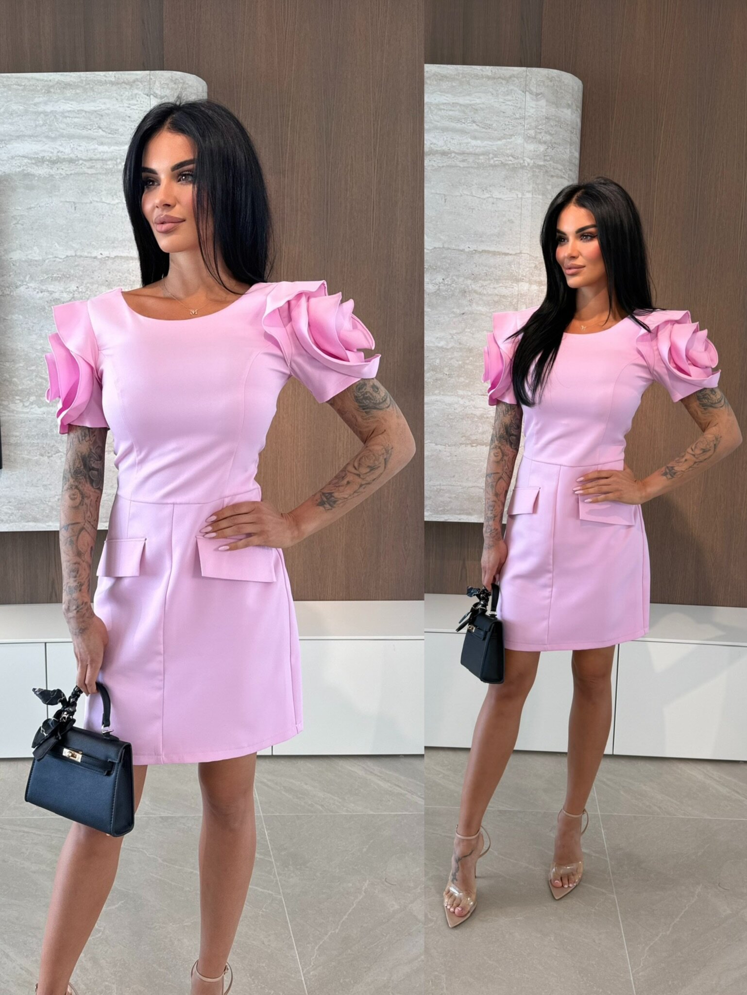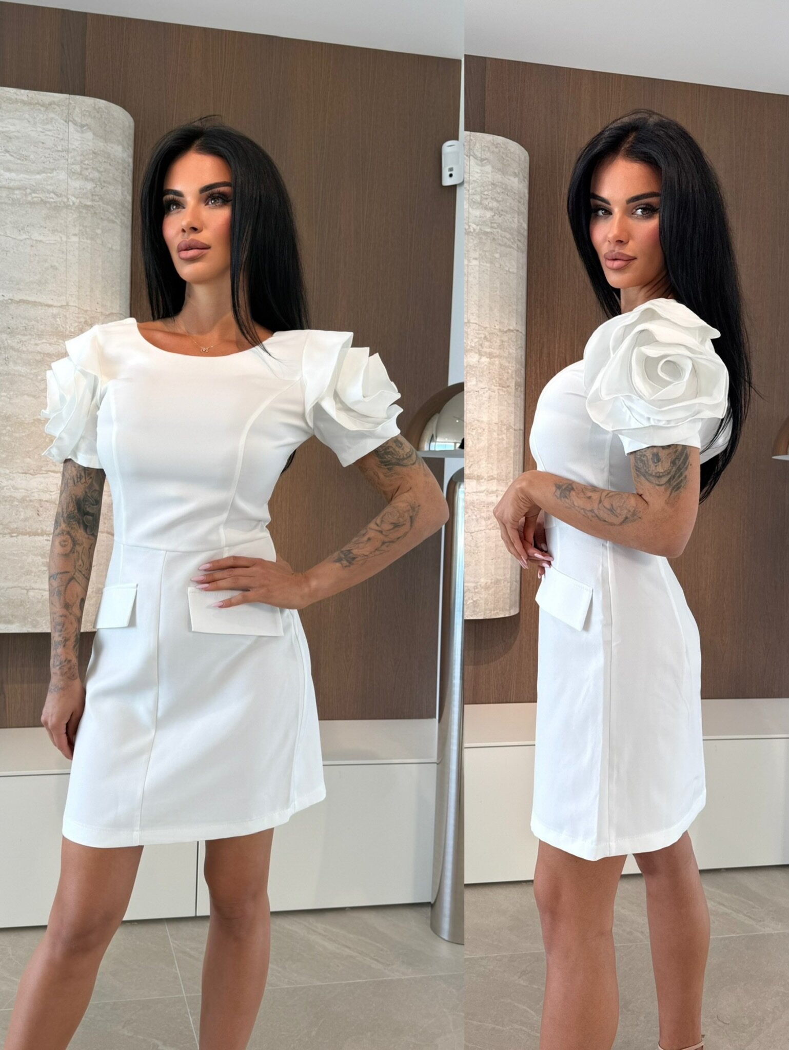 Elegancka sukienka mini z bufiastymi, kr贸tkimi r臋kawami i p贸艂okr膮g艂ym dekoltem, kt贸ra podkre艣la tali臋 i dodaje kobiecego uroku. Lekko rozkloszowany d贸艂 zapewnia swobod臋 ruch贸w, a dwie praktyczne kieszonki po bokach w okolicach bioder 艂膮cz膮 funkcjonalno艣膰 z stylem. R臋kawy ozdobione r贸偶ami nadaj膮 wyj膮tkowego, romantycznego charakteru. Idealna na codzienne i wieczorowe stylizacje.