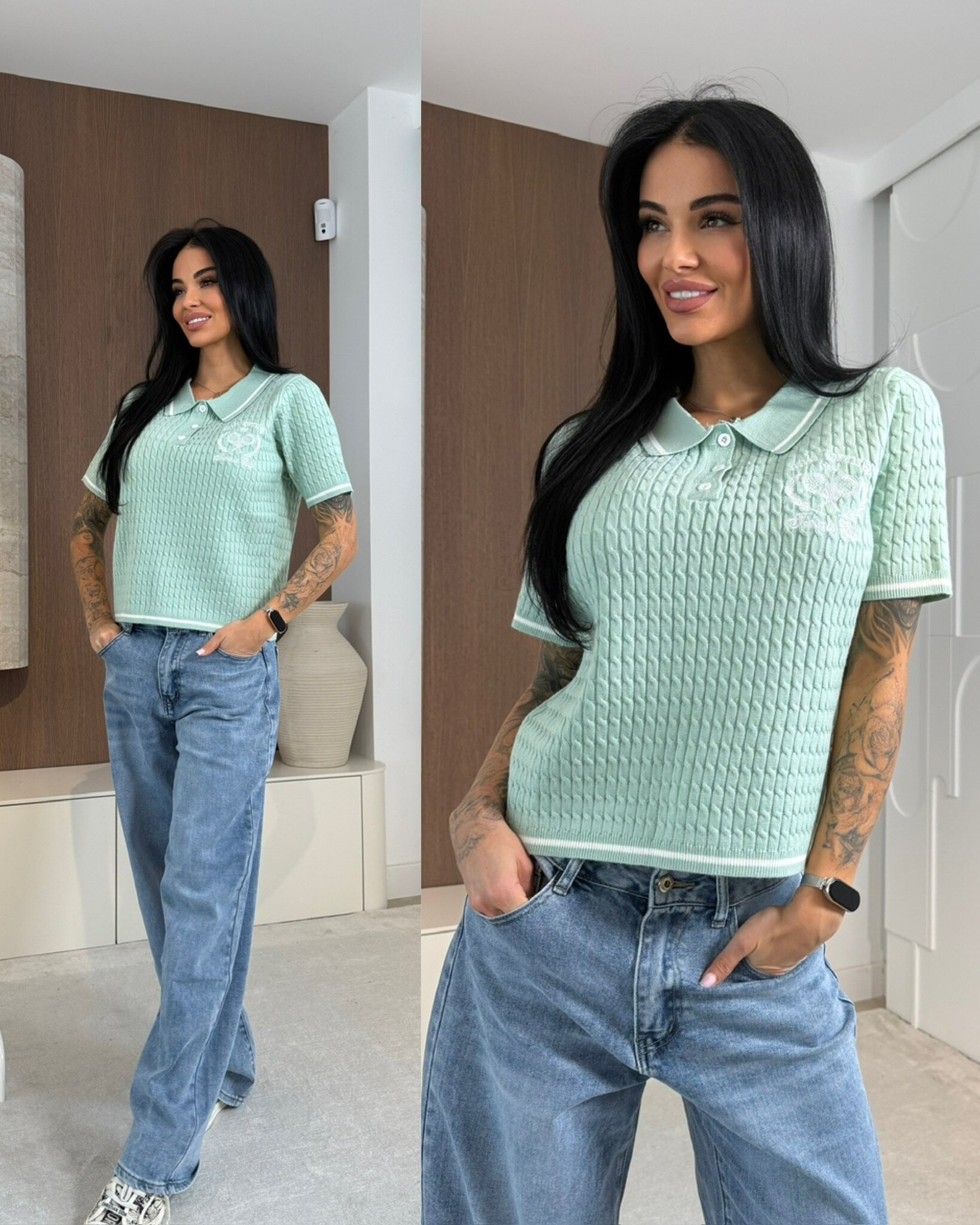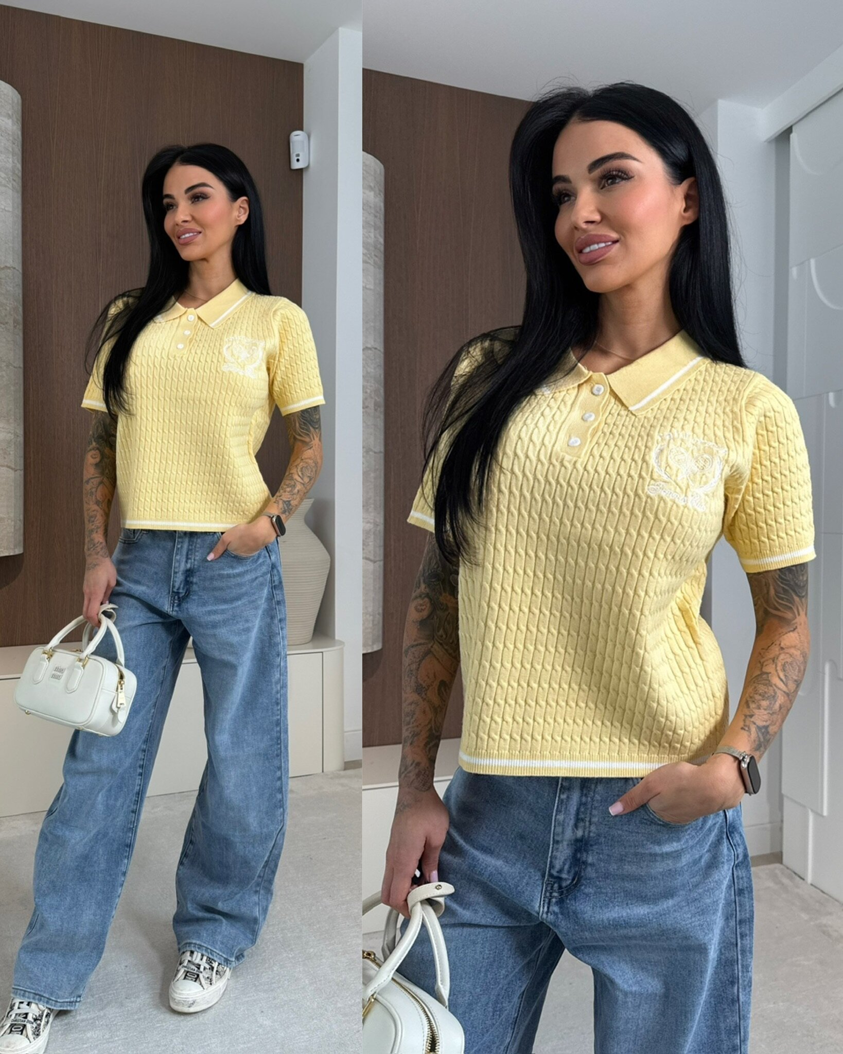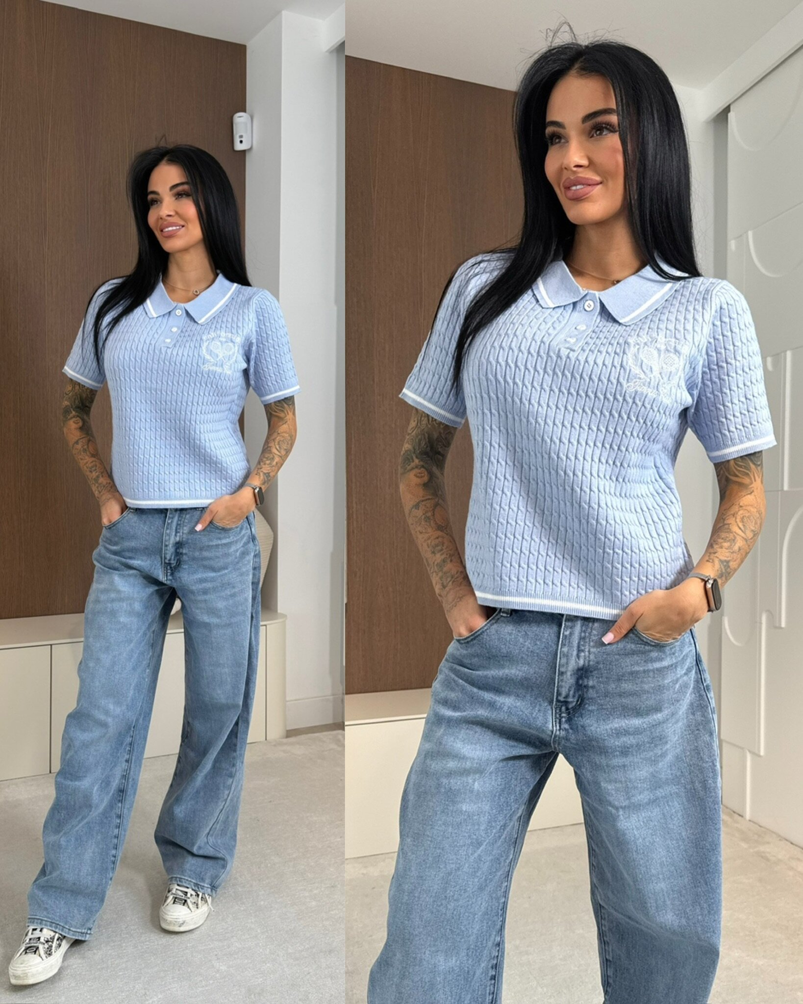 Stylowy sweterek damski o fasonie polo wykonany z mi臋kkiej, strukturalnej dzianiny. Model z kr贸tkim r臋kawem i ko艂nierzykiem zapinanym na zamek 艂膮czy sportow膮 elegancj臋 z komfortem noszenia. Idealny wyb贸r do codziennych stylizacji, pracy oraz zestaw贸w smart casual. 艢wietnie uk艂ada si臋 na sylwetce i wpisuje si臋 w aktualne trendy.