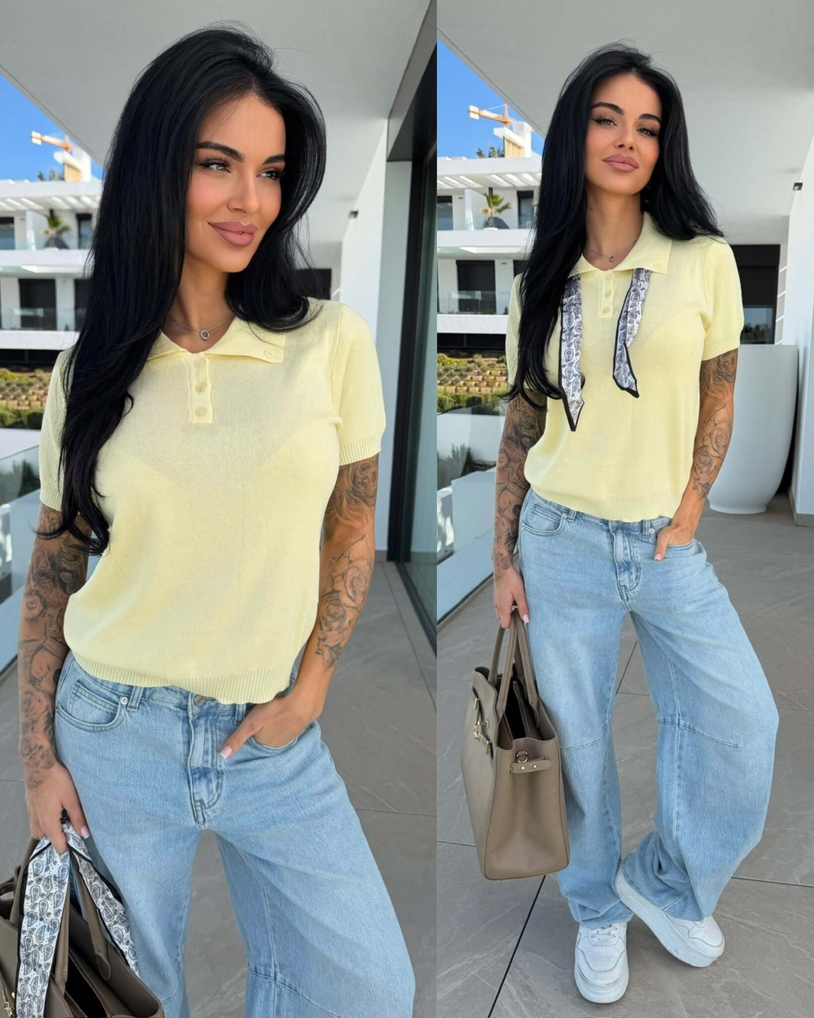 T-shirt Faletto z apaszką to idealna baza stylizacji. Modny krój z krótkim rękawem oraz guziczkami przy dekolcie. Wykonanie z miłej w dotyku tkaniny.