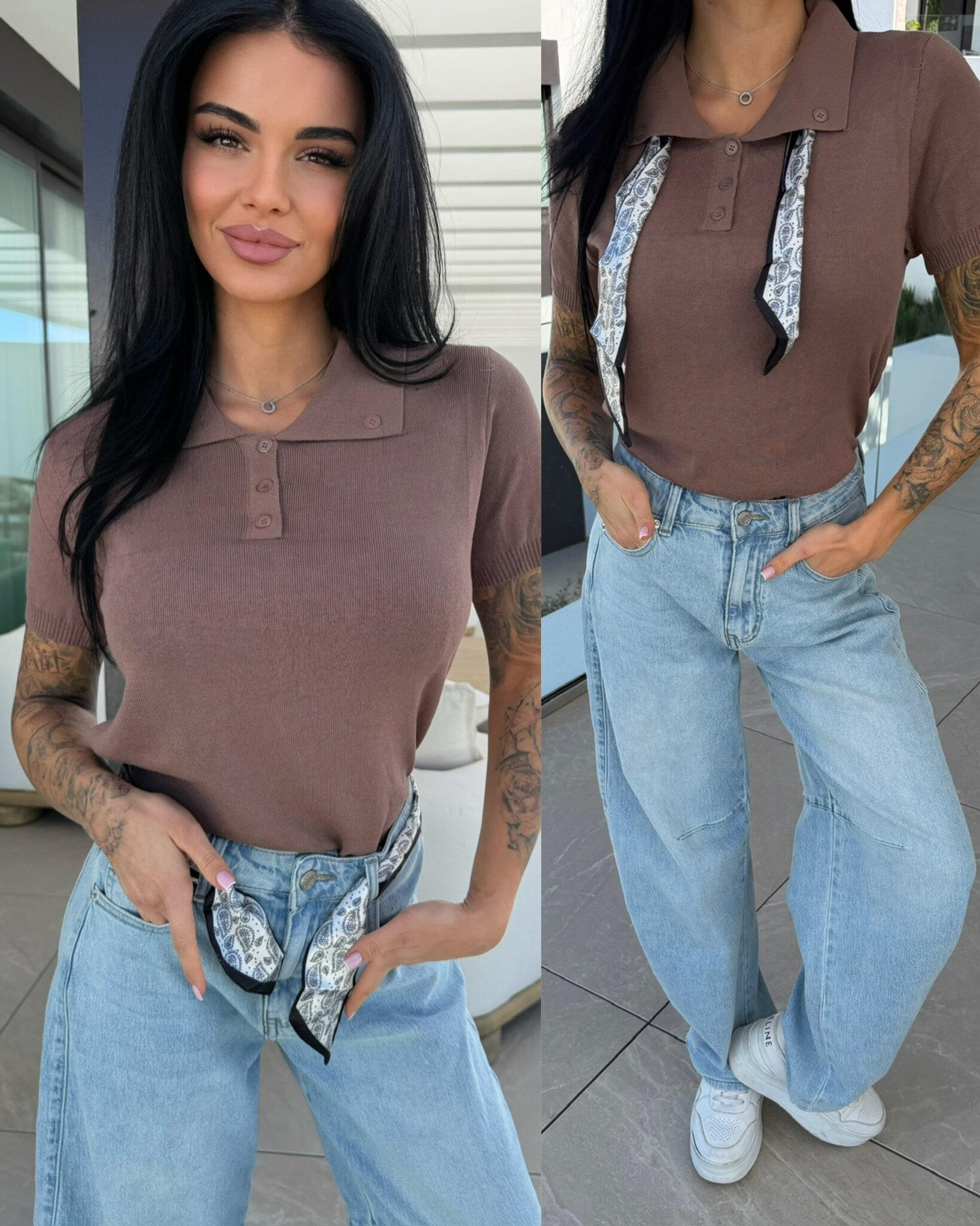 T-shirt Faletto z apaszką to idealna baza stylizacji. Modny krój z krótkim rękawem oraz guziczkami przy dekolcie. Wykonanie z miłej w dotyku tkaniny.