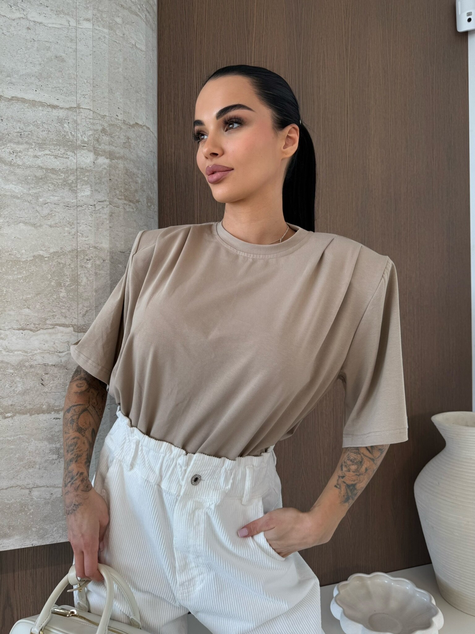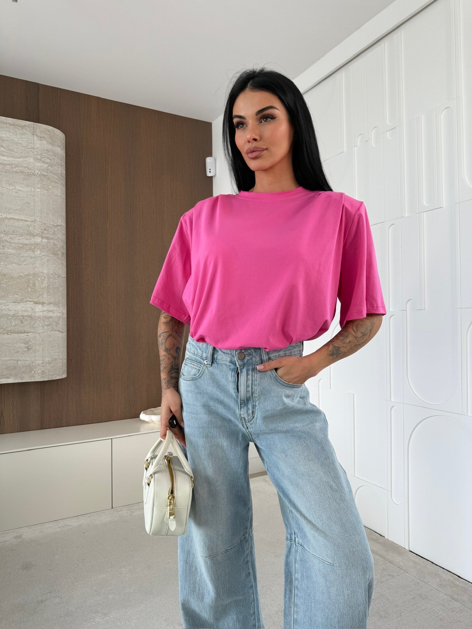 Gładkie wykończenie, wszyte poduszki. Luźniejszy krój.